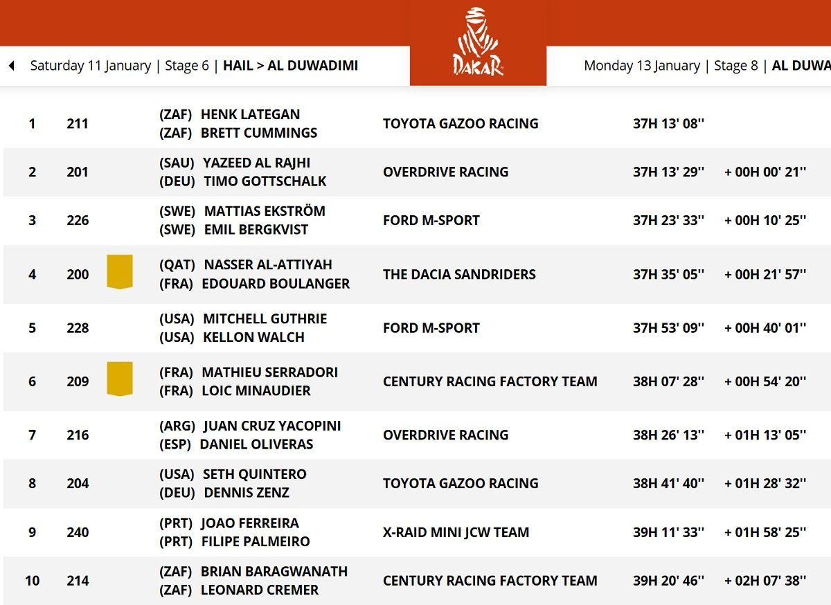 Έτσι, με το προβάδισμα του Λάτεγκαν στα 21’’ από τον Αλ Ραζί και στα 10’:25’’ από τον Έκστρομ, όλα είναι αντοιχτά για τη μάχη κορυφής στην αυριανή ΕΔ8 – στα 483 αγωνιστικά χιλιόμετρα από την Αλ Ντουαντίμι στην πρωτεύουσα Ριάντ. Και κανείς φυσικά δεν μπορεί να διαγράψει και τον Αλ Ατίγια, που είναι στα 22’ πίσω από την κορυφή.