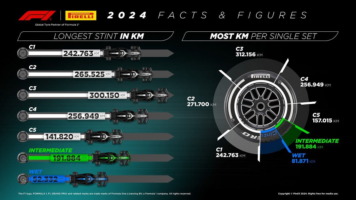 Η Pirelli δημοσίευσε μια σειρά από εντυπωσιακά στατιστικά των συνολικών χιλιομέτρων και της χρήσης των 5+2 τύπων ελαστικών της στα 24 GP της Formula 1 κατά τη σεζόν που πέρασε - τη μεγαλύτερη της ιστορίας του σπορ.