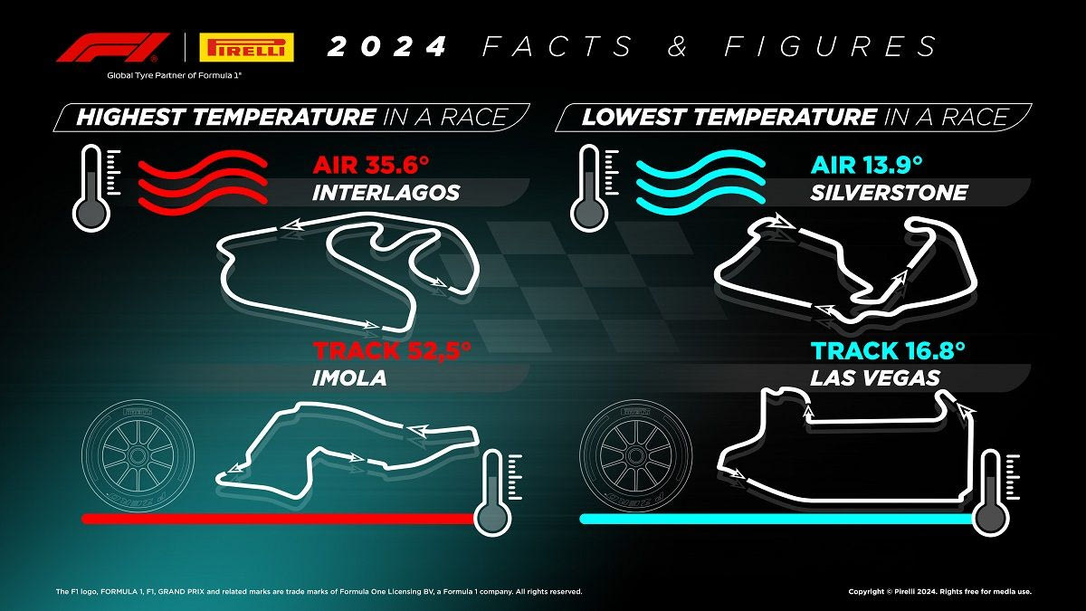 - Σε στιιγμιαίες μετρήσεις, στην Ουγγαρία παρατηρήθηκε η υψηλότερη θερμοκρασία της ασφάλτου, 58,6 °C, ενώ στο Σίλβερστοουν η άσφαλτος έπεσε σε ένα σημείο της πίστας και στους 12,8° Κελσίου.