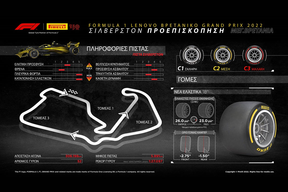 - Το Σίλβερστοουν, μαζί με τη Σουζούκα στην Ιαπωνία και το Σπα στο Βέλγιο, θέτουν τις υψηλότερες απαιτήσεις από τα ελαστικά. Φυσιολογικά λοιπόν η Pirelli έφερε τις πιο σκληρές γόμες στη γκάμα: C1 ως P Zero λευκή/σκληρή, C2 ως P Zero κίτρινη/μέση και C3 ως P Zero κόκκινη/μαλακή. Είναι η 3η φορά μέσα στη χρονιά που επιλέγεται αυτός ο συνδυασμός.