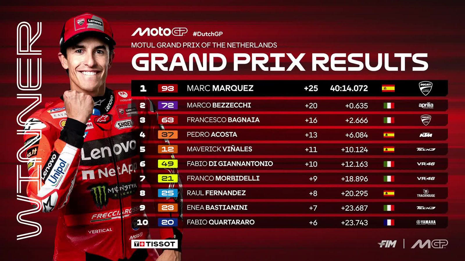 Ο Ισπανός της εργοστασιακής Ducati πραγματοποίησε μια εντυπωσιακή εμφάνιση στο MotoGP Ολλανδίας, ειδικά αν αναλογιστεί κανείς ότι την Παρασκευή είχε δύο ισχυρές πτώσεις υψηλής ταχύτητας. Παρ’ όλα αυτά, κατάφερε να κατακτήσει τη νίκη και στο Sprint και στον κυρίως αγώνα του εορταστικού Grand Prix για τα 100 χρόνια του Dutch TT.