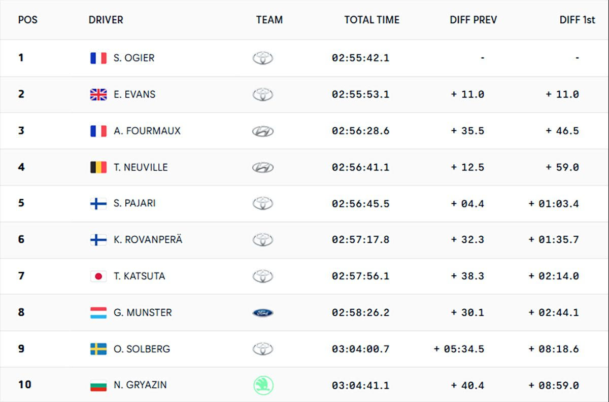 Στη μάχη των δύο Toyota GR Yaris Rally1 για τη νίκη στο Ράλι Χιλής, ο Σεμπαστιάν Οζιέ κέρδισε τον Έλφυν Έβανς με διαφορά 11 δευτερολέπτων, και με την απόλυτη συγκομιδή των 35 βαθμών από το όλο τριήμερο πέρασε τον Ουαλό στην κορυφή της βαθμολογίας με μόλις δύο βαθμούς.