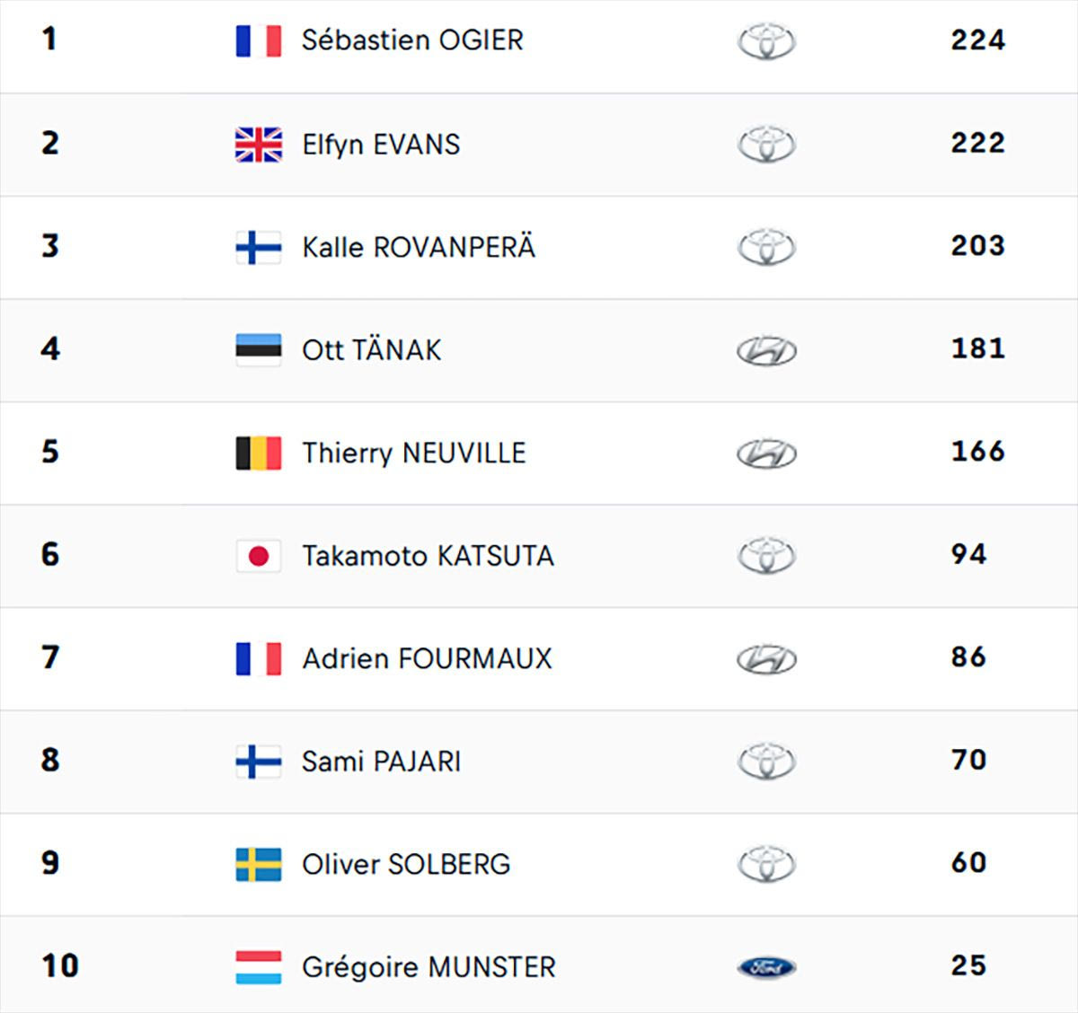 Ως αποτέλεσμα, οι Οζιέ και Έβανς αποσπάστηκαν λίγο από τον Ροβάνπερα στις τρεις πρώτες θέσεις της βαθμολογίας, ενώ πλέον οι Νεβίλ και Τάνακ έχουν να ελπίζουν μόνο σε ένα θαύμα για τον φετινό τίτλο.Ο Οζιέ και ο συνοδηγός του, Βενσάν Λαντέ, πήραν και τους 10 βαθμούς του Super Sunday, όπως και τους 5 της Power Stage. “Οι βαθμοί είναι δίκαιοι, ειδικά μετά την ατυχία μας στην Παραγουάη. Ο Βενσάν κάνει εξαιρετική δουλειά, η ομάδα μου έδωσε τέλεια εργαλεία για να παλέψω, είναι απίστευτο”, δήλωσε ο Γάλλος που έφτασε τις 66 νίκες σε 200 εκκινήσεις.