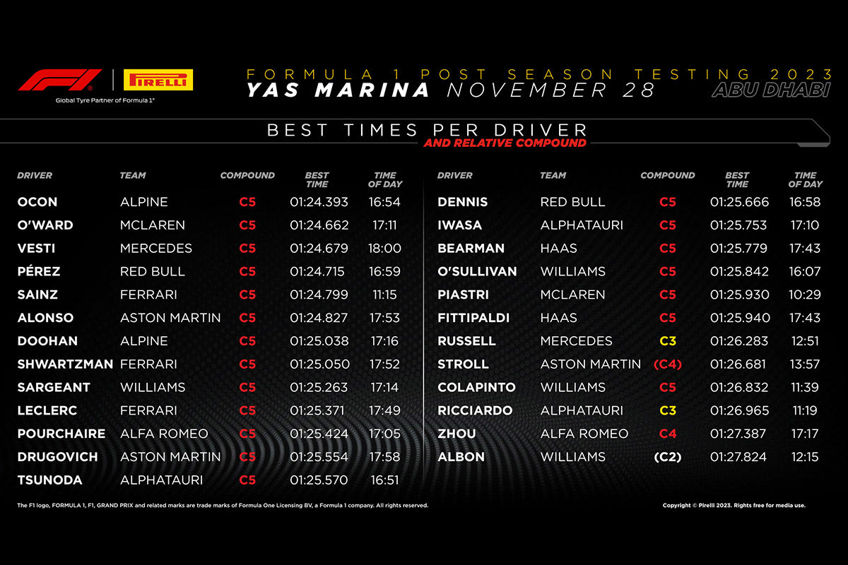 Ταχύτερα από τον Ισπανό, εν συνεχεία, κινήθηκε και ο πρωταγωνιστής στις ΗΠΑ Πέιτο Ο’ Ουόρντ με τη McLaren MCL60, ο δεύτερος της φετινής F2 Φρέντερικ Βέστι με τη Mercedes και ο Τσέκο Πέρεζ με τη Red Bull RB19. Ο Μαξ Φερστάπεν δεν συμμετείχε σε αυτές τις δοκιμές, ούτε και ο Λιούις Χάμιλτον. Όμως το παρόν έδωσε ο Φερνάντο Αλόνσο, που μοιράστηκε την Aston Martin AMR23 με τον Λανς Στρολ.