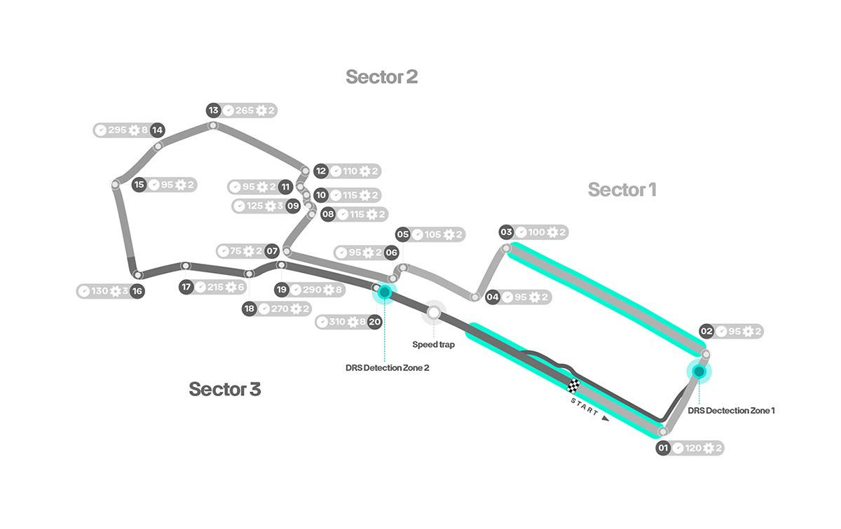 - Στα 6 χιλιόμετρα του σιρκουί, παρά τις 20 στροφές του, η τεράστια ευθεία του (μήκους 2 km) θεωρείται η “Μέκκα” του slipstreaming – με ταχύτητες που μπορεί να ξεπερνούν τα 350 km/h, πριν φτάσει στην πολύ φαρδιά “Στροφή 1” των 90 μοιρών που ακολουθεί, προσφέροντας ευκαιρίες προσπέρασης.