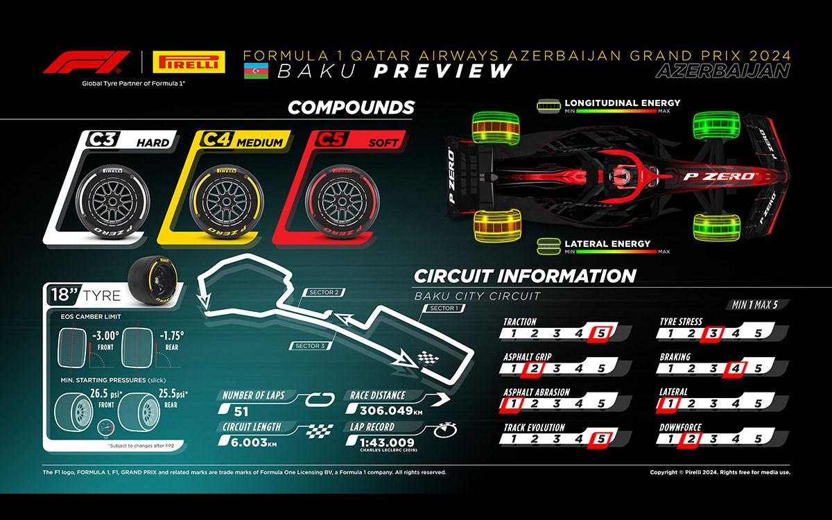 Οι πολύ υψηλές τελικές ταχύτητες στη μεγάλη ευθεία του Μπακού καταπονούν ιδιαίτερα τα ελαστικά, δεδομένης της πολύ υψηλής άντωσης που παράγει το μονοθέσιο – πιέζοντάς το προς την άσφαλτο. Επιπλέον, τα ελαστικά θα καταπονούνται ακόμα περισσότερο από την προαναφερθείσα ανάγκη των ομάδων να βασιστεί σε αυτά στο αργό 2ο τμήμα της πίστας.