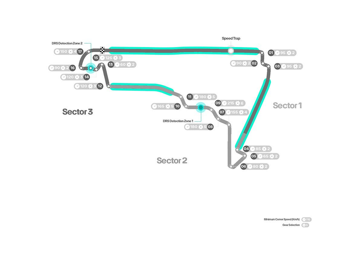 • Η πίστα βρίσκεται περισσότερα από 2.000 μέτρα πάνω από την επιφάνεια της θάλασσας, και το αυξημένο υψόμετρο σημαίνει ότι ο αέρας είναι λεπτός και το οξυγόνο περιορισμένο. Με τη σειρά του, αυτό σημαίνει ότι η “αναπνοή” των κινητήρων είναι περιορισμένη, όπως και η παραγόμενη άντωση (κάθετη δύναμη) των μονοθεσίων. Έτσι, παρότι το σχέδιο της πίστας είναι τυπικό μιας πίστας ρύθμισης των μονοθεσίων για υψηλή άντωση, η τελική τους ταχύτητα είναι πολύ υψηλή.