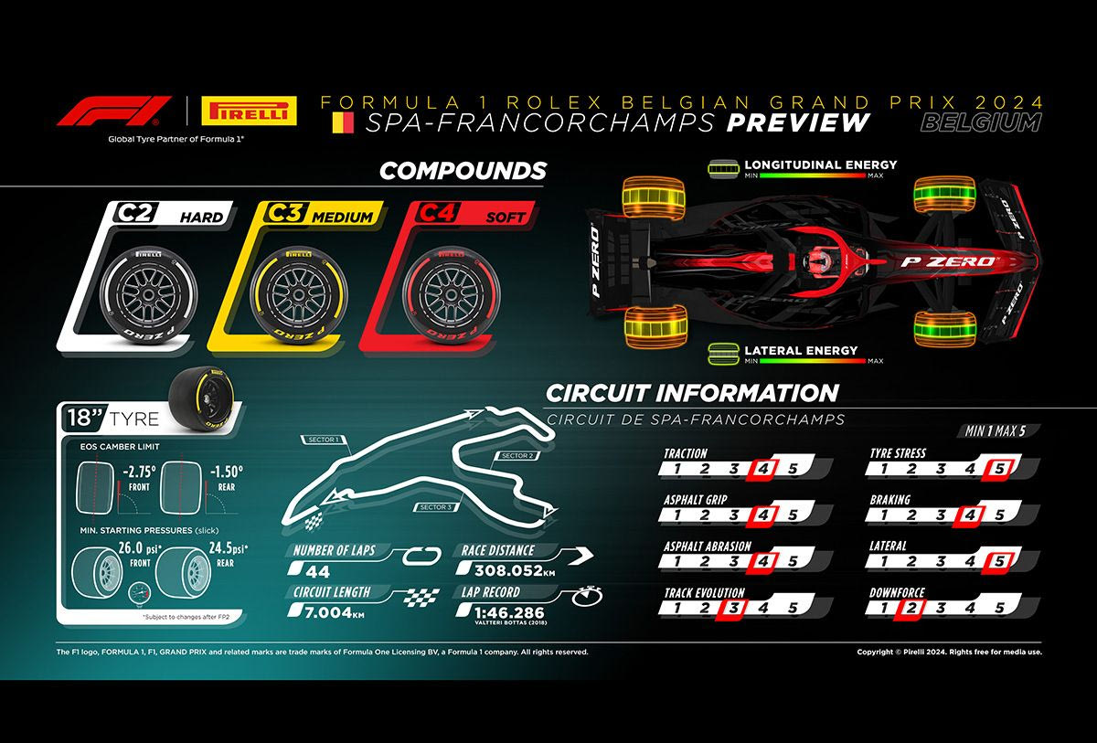 Οι δύο κρισιμότερες παράμετροι για τη διαχείριση των ελαστικών και τη στρατηγική στον αγώνα του Βελγίου είναι η πολύ ισχυρές δυνάμεις που ασκούνται στους τροχούς στις πολύ γρήγορες στροφές της πίστας, καθώς και η νέα άσφαλτος που έχει στρωθεί φέτος στα 7 χιλιόμετρα του σιρκουί του Σπα.