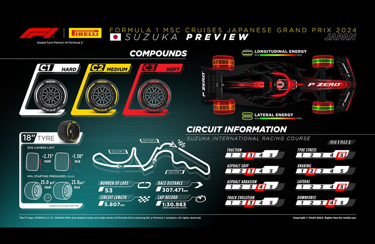 Η διεξαγωγή του GP Ιαπωνίας νωρίς την Άνοιξη, πέραν του αυξημένου ενδεχομένου βροχής (70%), φέρνει και χαμηλότερες θερμοκρασίες από τις συνηθισμένες – που θα κυμαίνονται από 8-13° Κελσίου. Παράλληλα, η πίστα των 5,8 χιλιομέτρων προβάλλει μια σειρά από προκλήσεις για τα ελαστικά, τόσο λόγω της τραχύτητας της ασφάλτου όσο και λόγω των τεράστιων δυνάμεων που ασκούνται σε αυτά στις πολύ γρήγορες στροφές.