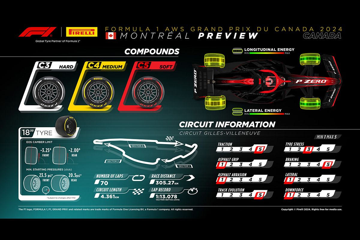 Η πίστα του Μόντρεαλ είναι από αυτές που ασκούν πολύ χαμηλή καταπόνηση στα ελαστικά: οι πλευρικές καταπονήσεις είναι πολύ χαμηλές, αλλά εκείνες στο διαμήκη άξονα του μονοθεσίου (κυρίως λόγω των ισχυρών επιβραδύνσεων) είναι μεγαλύτερες. Αλλά γενικώς, είναι μια από τις πίστες της σεζόν που καταπονούν λιγότερο τη γόμα.