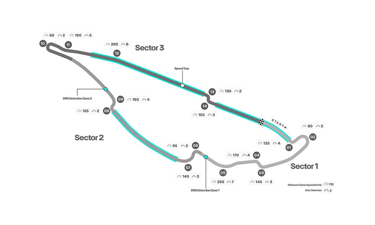 - Το σιρκουί είναι γρήγορο, με ρυθμίσεις χαμηλής άντωσης των μονοθεσίων. Αποτελείται κυρίως από μεγάλες ευθείες που διακόπτονται από στενά σικέιν, και βεβαίως από την κλασσική φουρκέτα. Ένα εμβληματικό σημείο είναι ο περίφημος “τοίχος των πρωταθλητών” στην έξοδο της τελευταίας στροφής από το τελικό σικέιν. Πήρε το όνομα αυτό από το GP του 1999 που προσέκρουσαν σε αυτόν οι πρωταθλητές Μίκαελ Σουμάχερ, Ζακ Βιλνέβ και Ντέιμον Χιλ.