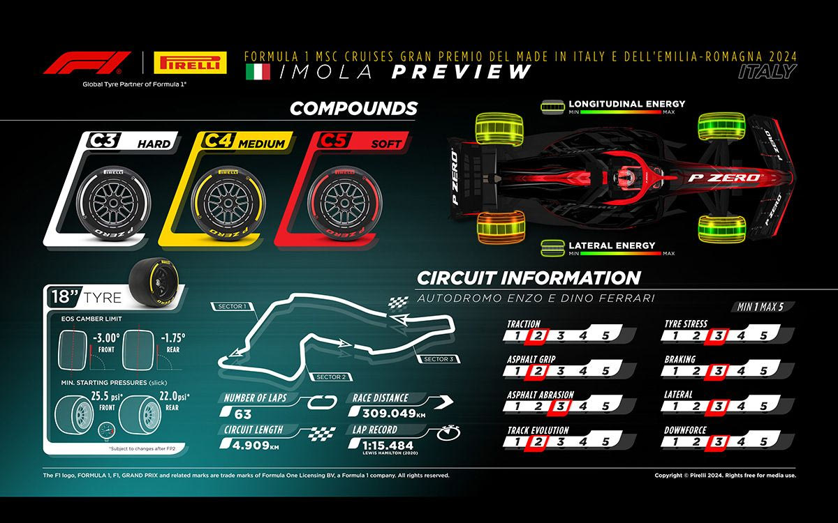 Η Pirelli παρέχει στις ομάδες για το GP της Ίμολα τις τρεις πιο μαλακές γόμες της γκάμας της (C3, C4, C5), όπως συνέβη και στο GP Αυστραλίας. Αυτό διευρύνει σημαντικά τις στρατηγικές επιλογές των ομάδων για τον αγώνα, όμως παραδοσιακά στην Ίμολα οι οδηγοί κάνουν μόνο ένα πιτ-στοπ.