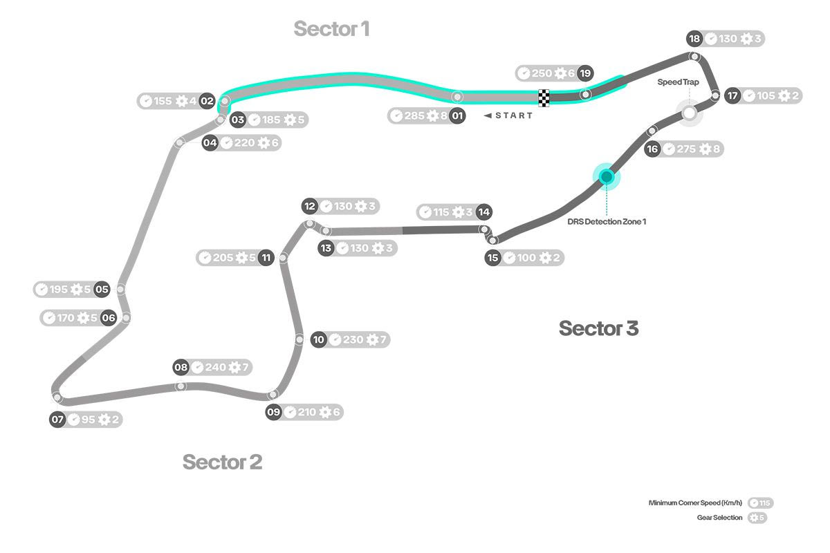 - Με 19 στροφές και υψομετρική διαφορά 30 μέτρων κατά μήκος της, η πίστα είναι αρκετά στενή και έχει μόνο μία ζώνη DRS. Συνεπώς, οι δοκιμές κατάταξης παίζουν σημαντικό ρόλο, και αποδεικνύεται από το γεγονός ότι κανένας οδηγός δεν έχει κερδίσει ποτέ εκεί εκκινώντας πιο πίσω από την 8η θέση.