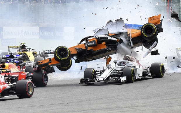Mclaren driver Fernando Alonso of Spain, top, goes over the top of Sauber driver Charles Leclerc of Monaco as they are involved in a crash at the start of the Belgian Formula One Grand Prix in Spa-Francorchamps, Belgium, Sunday, Aug. 26, 2018. (AP Photo/Geert Vanden Wijngaert)