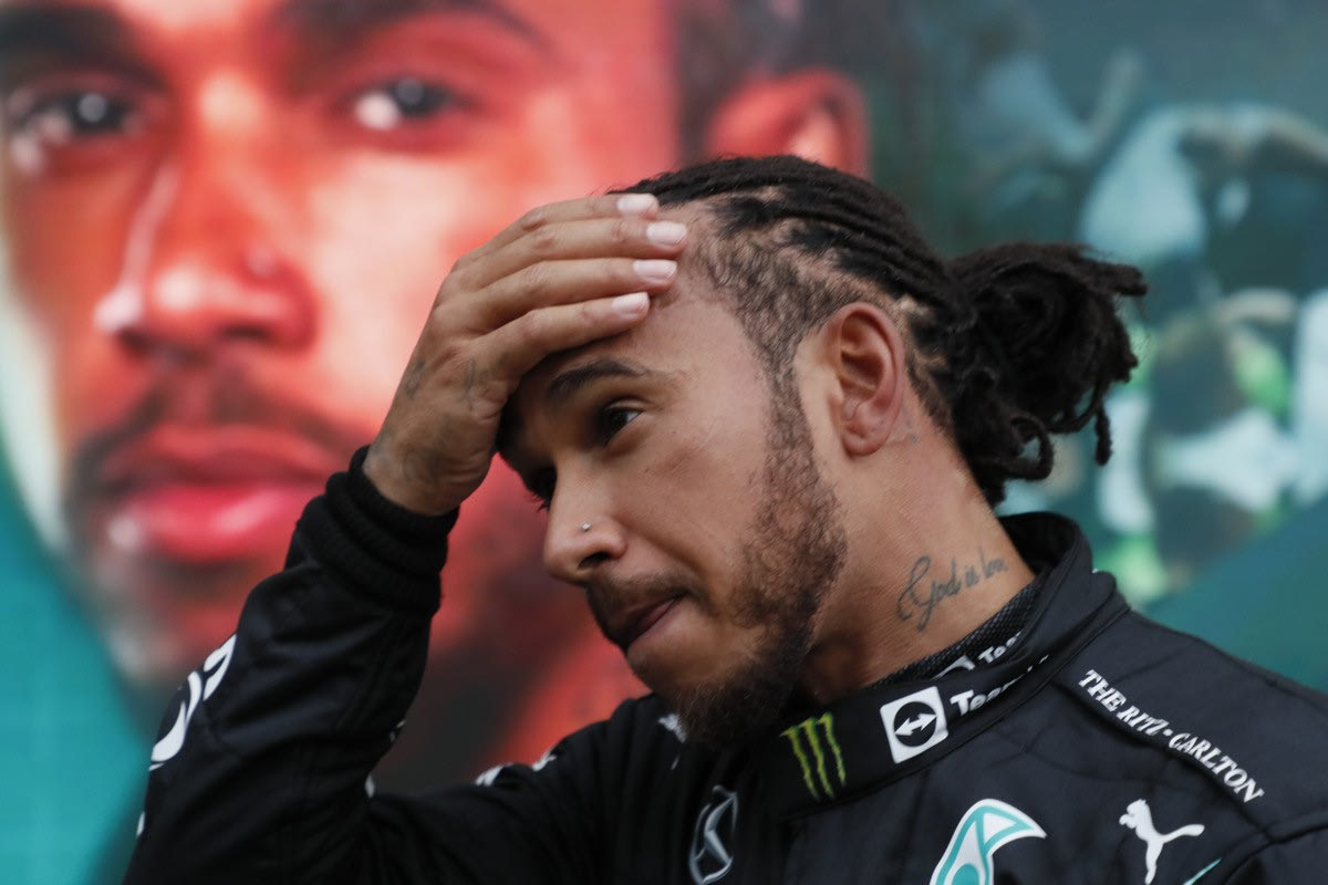 Mercedes driver Lewis Hamilton of Britain reacts after wining the Russian Formula One Grand Prix at the Sochi Autodrom circuit, in Sochi, Russia, Sunday, Sept. 26, 2021. (Yuri Kochetkov/Pool Photo via AP) Photo Credits: © 2021 Yuri Kochetkov / AP Images