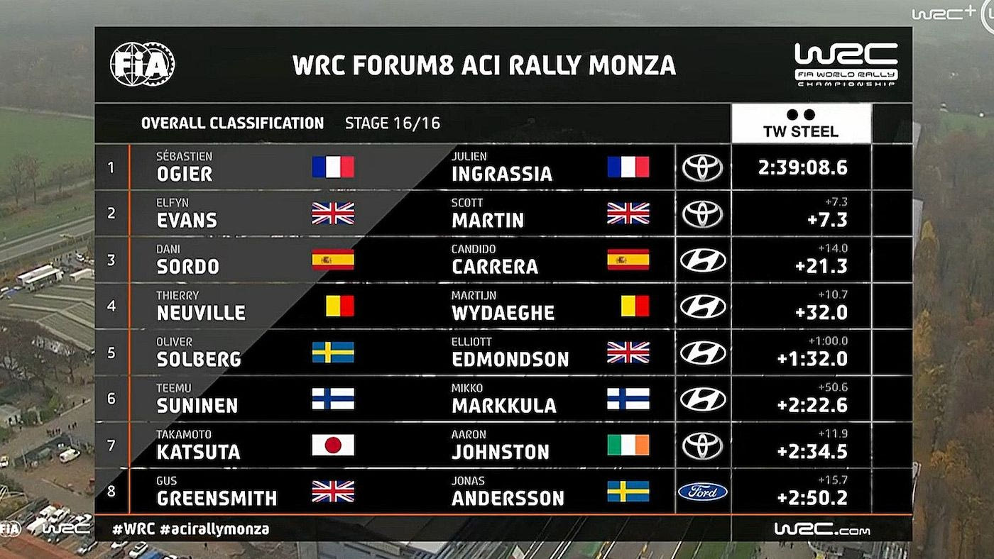 Τον ιδανικό αποχαιρετισμό στο WRC έκανε ο Σεμπαστιάν Οζιέ, κατακτώντας μαζί με τη νίκη στο Ράλι Μόντσα και το όγδοό του παγκόσμιο τίτλο, στην τελευταία του πλήρη σεζόν. Η Toyota επέστρεψε στο θρόνο των κατασκευαστών.