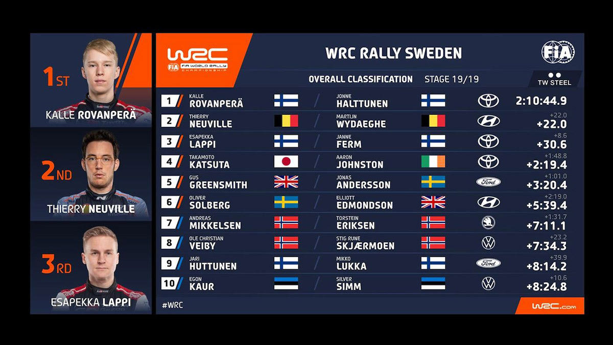 Τώρα, ο υιός Κάλε Ροβάνπερα όχι μόνο κατέκτησε την τρίτη νίκη του στο σπορ, αλλά και ταυτόχρονα ανέβηκε στην κορυφή της βαθμολογίας οδηγών με διαφορά 14 βαθμών από τον Τιερί Νεβίλ της Hyundai – που ανέβηκε στη δεύτερη θέση του σημερινού βάθρου, εμπρός από τον Εσαπέκα Λάπι με τον τρίτο εργοστασιακό Yaris Rally1.