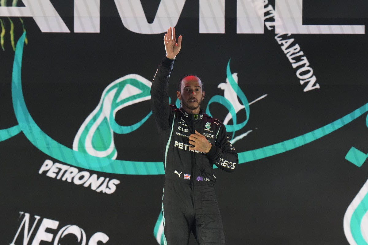 Mercedes driver Lewis Hamilton of Britain waves from the podium after winning the Formula One Saudi Arabian Grand Prix in Jiddah, Sunday, Dec. 5, 2021. Left is second placed Red Bull driver Max Verstappen of the Netherlands and Ron the right is third, Mercedes driver Valtteri Bottas of Finland. (AP Photo/Hassan Ammar) AP