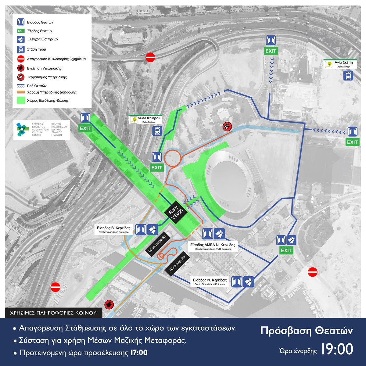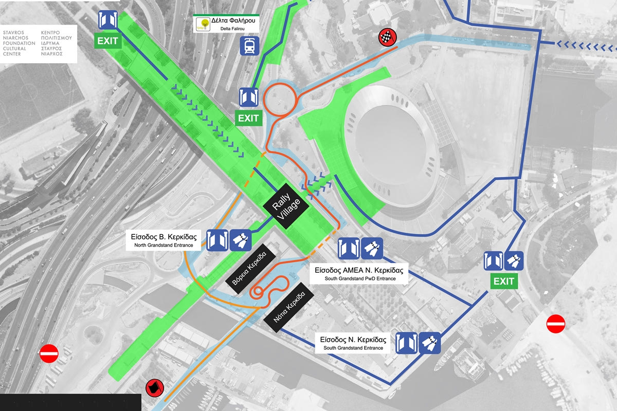 Σε όλες τις προσβάσεις θεατών θα βρίσκονται άνθρωποι της διοργάνωσης δίνοντας πληροφορίες κατεύθυνσης προς τα σημεία θεατών, ενώ από νωρίς το μεσημέρι θα είναι σε λειτουργία το Rally Village του αγώνα, με περίπτερα των χορηγών, δραστηριότητες κ.ά., στο χώρο της Εσπλανάδας –ο πεζόδρομος που από το Κέντρο Πολιτισμού Ίδρυμα Σταύρος Νιάρχος οδηγεί στη Μαρίνα Φαλήρου.
