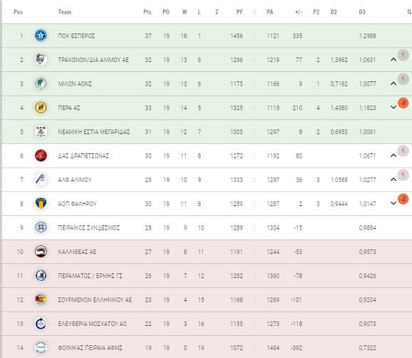 Στο μεταξύ, ο Εσπερος δεν αντιμετώπισε κανένα πρόβλημα απέναντι στην Ελευθερία Μοσχάτου. Η ομάδα της Καλλιθέας επικράτησε πολύ εύκολα με 84-60, έφτασε τις πέντε σερί νίκες και παρέμεινε με διαφορά πρώτη, τρεις βαθμούς πάνω από το δεύτερο Πέρα, το οποίο πέρασε κι αυτό εύκολο βράδυ στο Παλαιό Φάληρο (67-51).