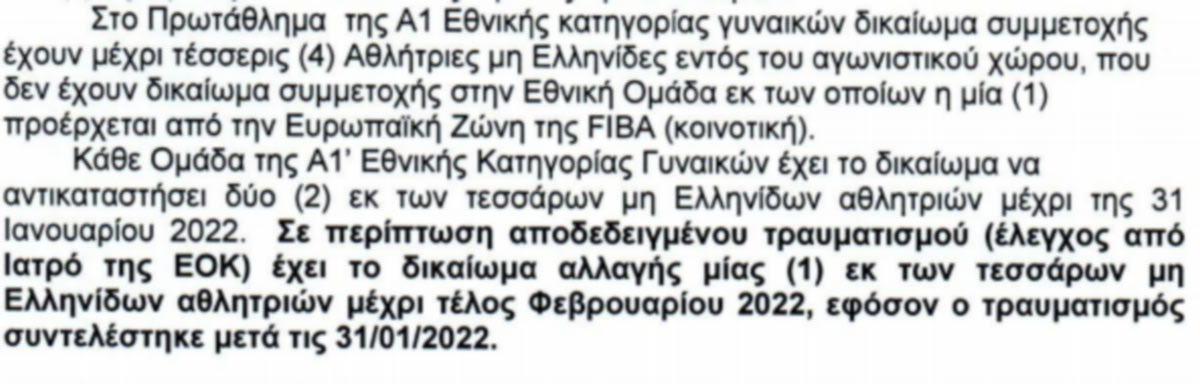 Την δυνατότητα να έχουν συνολικά τέσσερις ξένες αθλήτριες εκ των οποίων η μία θα είναι από την Ευρωπαϊκή ζώνη της FIBA (κοινοτική), θα έχουν οι ομάδες της Α1 γυναικών σύμφωνα με την νέα προκήρυξη του πρωταθλήματος. Έως τώρα οι ομάδες είχαν δικαίωμα να έχουν στο ρόστερ τους τρεις συνολικά αθλήτριες εκτός Ελλάδας με τον αριθμό αυτό να αυξάνεται σε μία παραπάνω.