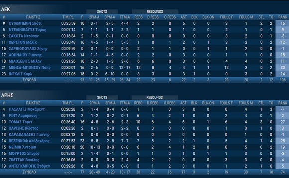 Παρά την ήττα, οι παίκτες του Άρη υπερίσχυσαν στα ριμπάουντ, έχοντας 40 έναντι 32 των αντιπάλων τους. Τα 17 εξ αυτών, μάλιστα, ήταν επιθετικά.