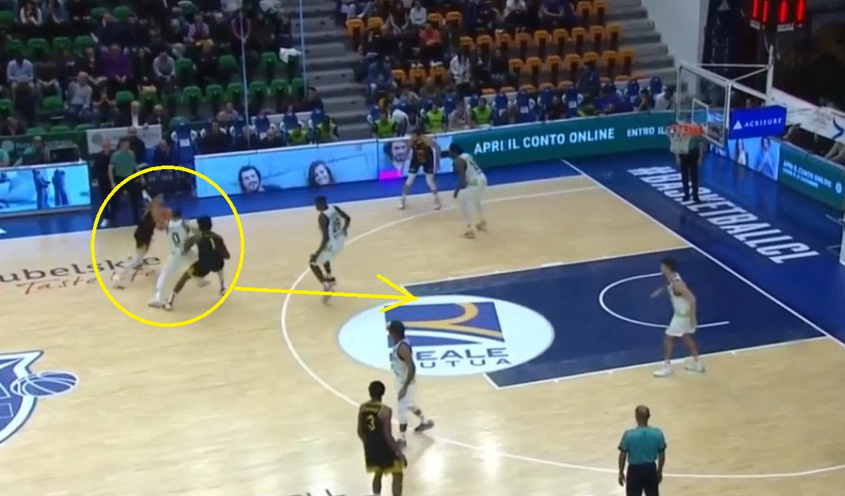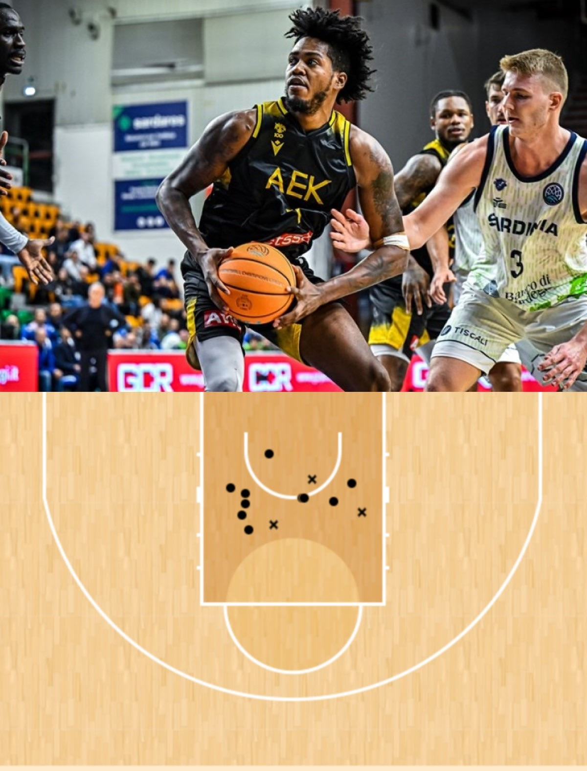 Ο Αμερικανός ψηλός εκμεταλλεύτηκε το γεγονός ότι η Σάσαρι έπαιζε “ICE” στον Pick and Roll της ΑΕΚ, στέλνοντας τους χειριστές δηλαδή στην πλάγια γραμμή. Αφού λοιπόν δεν μπορούσε να δώσει το σκριν, έκανε το λεγόμενο Short Roll (έκοβε στα 4 μέτρα αντί να ρολάρει στο καλάθι) και σούταρε με το γνωστό του στυλ. Ιδού ένα παράδειγμα.