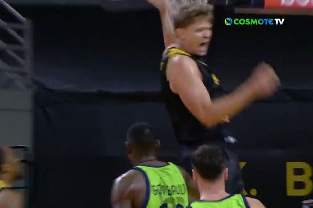 Καρφώματα μοίρασε ο Μιντάουγκας Κουζμίνσκας στο ματς της ΑΕΚ Betsson με τη Σάσαρι. Σε ένα από αυτά έκανε μάλιστα πόστερ τον Βασίλη Χαραλαμπόπουλο.