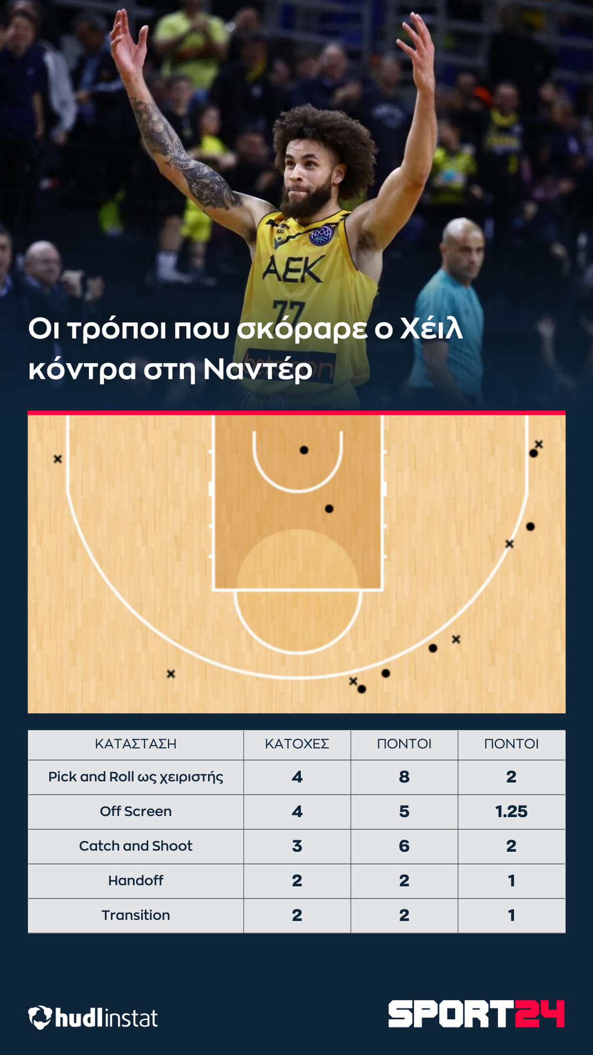 *Με κυκλάκι τα εύστοχα σουτ, με “x” τα άστοχαΟ Αμερικανός γκαρντ σκόραρε με πολλούς διαφορετικούς τρόπους, δείχνοντας, ξανά την κλάση του. Την ίδια στιγμή, όμως, μοίρασε σωστά και το παιχνίδι. Τελείωσε τον αγώνα με 23 πόντους και 7 ασίστ, που έδωσαν άλλους 16 πόντους στην “Ένωση”. Κοινώς, ήταν υπεύθυνος για 39 πόντους των “κιτρινόμαυρων”, σε ένα μοναδικό σόου.