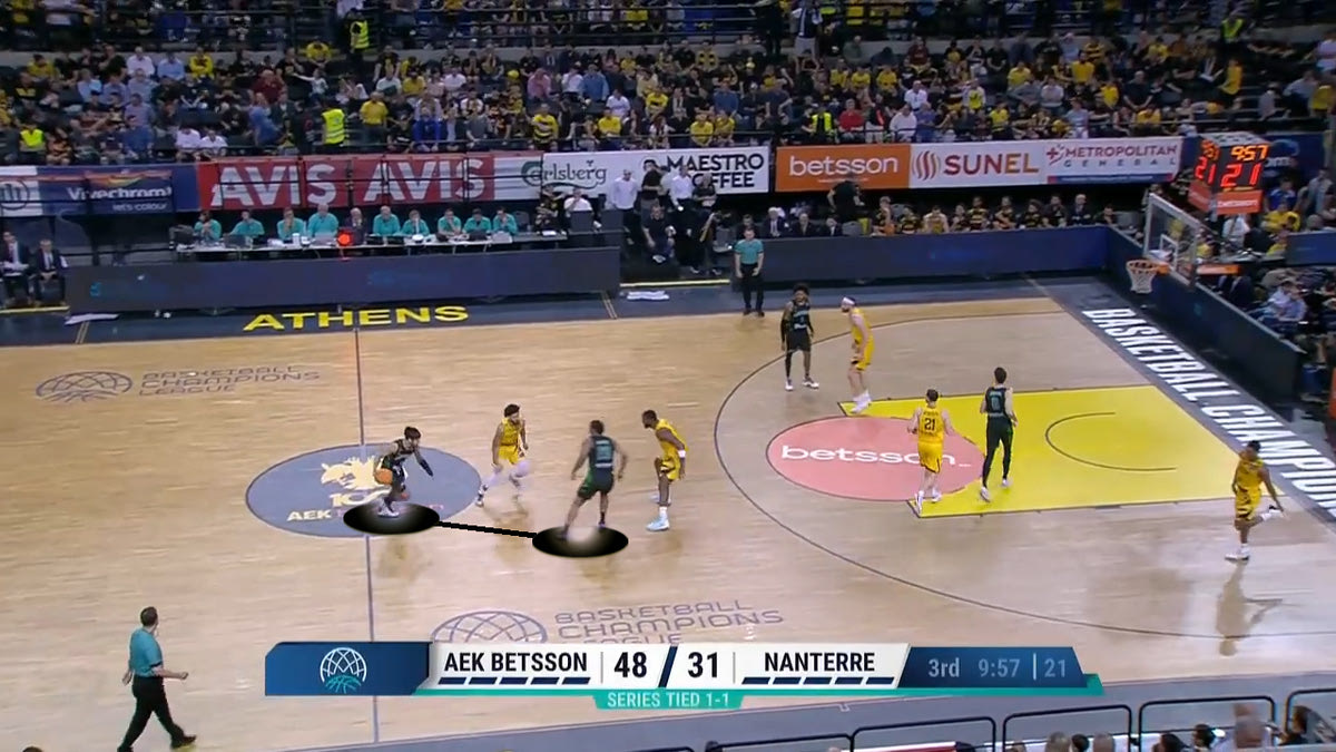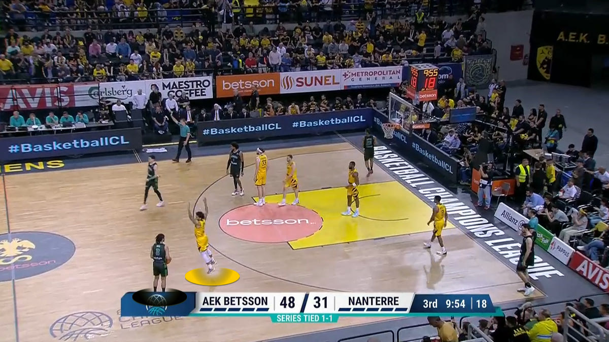 Ο Σεν κατεβάζει την μπάλα και ετοιμάζεται να πάρει σκριν για να παίξει το Pick and Roll. Οι διαιτητές διακόπτουν το παιχνίδι, επειδή οι φίλοι της ΑΕΚ Betsson πέταξαν χαρτάκια στο παρκέ, στην άλλη πλευρά του γηπέδου.