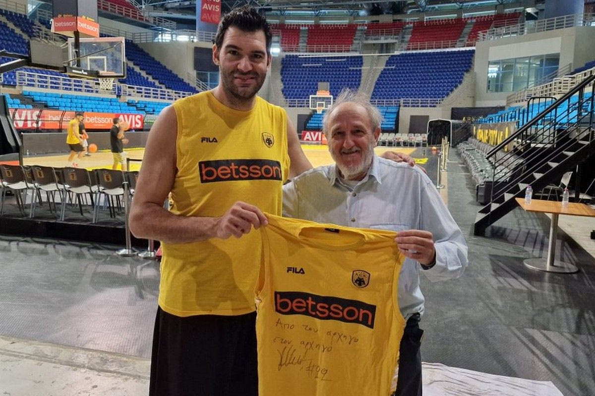 Ακολούθως, παρέλαβε μία φανέλα της ΑΕΚ από τον Δημήτρη Μαυροειδή με την υπογραφή του, και κατόπιν μίλησε στους παίκτες.