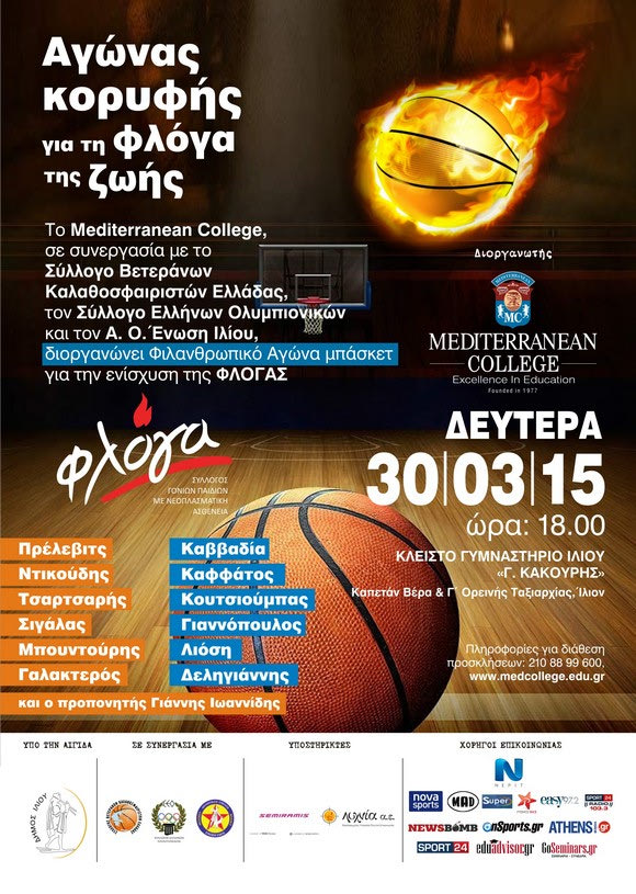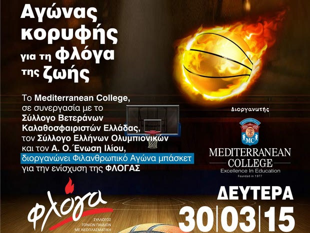 Το Mediterranean College σε συνεργασία με το Σύλλογο Βετεράνων Καλαθοσφαιριστών Ελλάδας, το Σύλλογο Ελλήνων Ολυμπιονικών και τον Α.Ο. Ένωση Ιλίου διοργανώνει φιλανθρωπικό αγώνα μπάσκετ τη Δευτέρα 30 ΜΑΡΤΙΟΥ 2015 & ώρα 18.00 στο Κλειστό Γυμναστήριο Ιλίου «Γ. ΚΑΚΟΥΡΗΣ» για την ενίσχυση των σκοπών του Συλλόγου Γονιών Παιδιών με Νεοπλασματική Ασθένια ΦΛΟΓΑ, υπό την Αιγίδα του Δήμου Ιλίου.