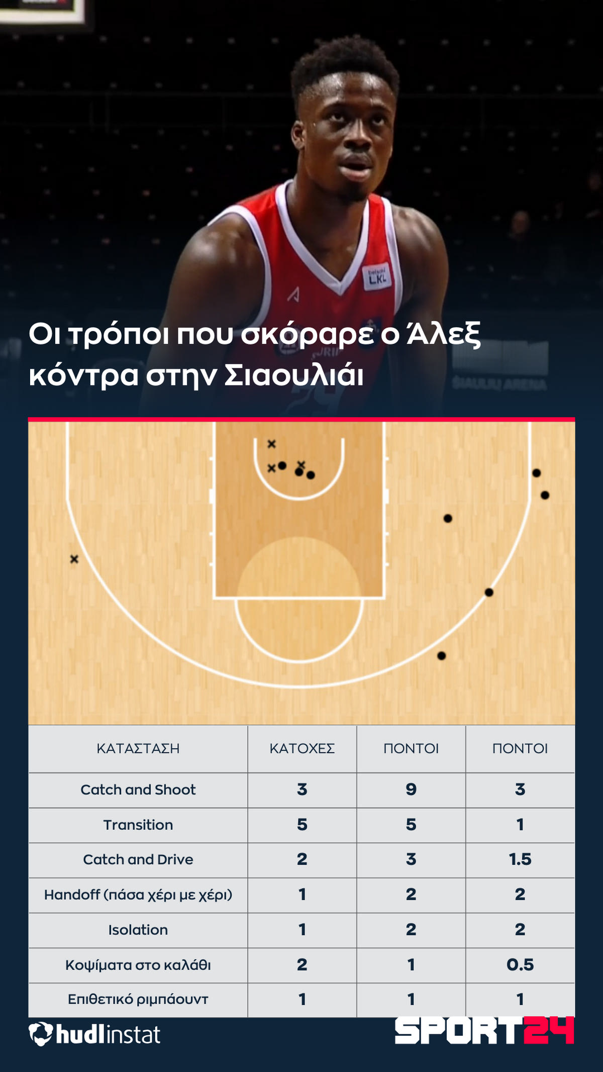 Το SPORT24 αναλύει με την βοήθεια του Hudl Instat την εμφάνιση του Άλεξ Αντετοκούνμπο στην νίκη της Μαζεϊκάι επί της Σιαουλιάι, όπου είχε 23 πόντους και ήταν ο πρώτος σκόρερ της ομάδας του, που επέστρεψε από το -18 για να πάρει την νίκη. Τα Spot Up τρίποντα, οι πόντοι στο ανοιχτό γήπεδο και τα highlights της εμφάνισής του. .