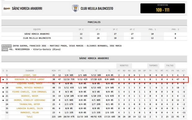 #LEBOro J.Robinson comenzó el año con una exhibición ofensiva, 47 puntos (12/16T2 5/12T3 8/8TL) aunque no pudo llevarse la victoria con @araberri. Lastima que el vídeo se coma algunas canastas pero se pueden ver algunas de ellas. Un #NCAARookie que empieza bien como profesional. pic.twitter.com/wAb5GkZMQh