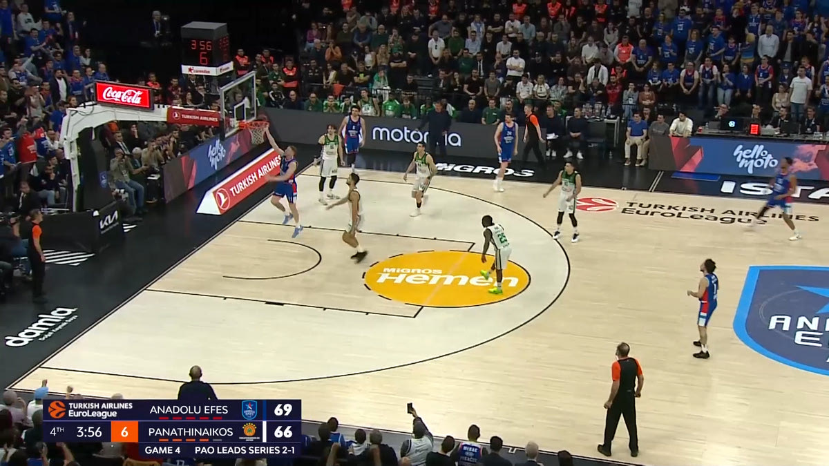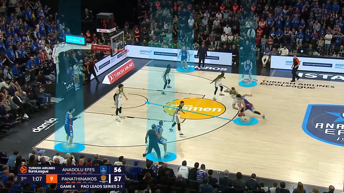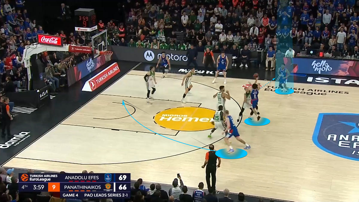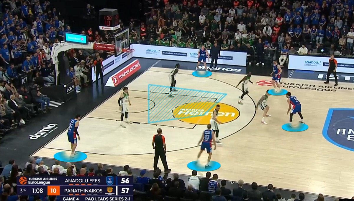 Η Εφές παίζει Hedge Out (ο ψηλός βγαίνει σε βοήθεια). Ο Γιούρτσεβεν ρολάρει στο καλάθι, δίνοντας επιλογή πάσας στον Ναν (που δεν πασάρει), ενώ ο Σλούκας ανεβαίνει στις 45 μοίρες.