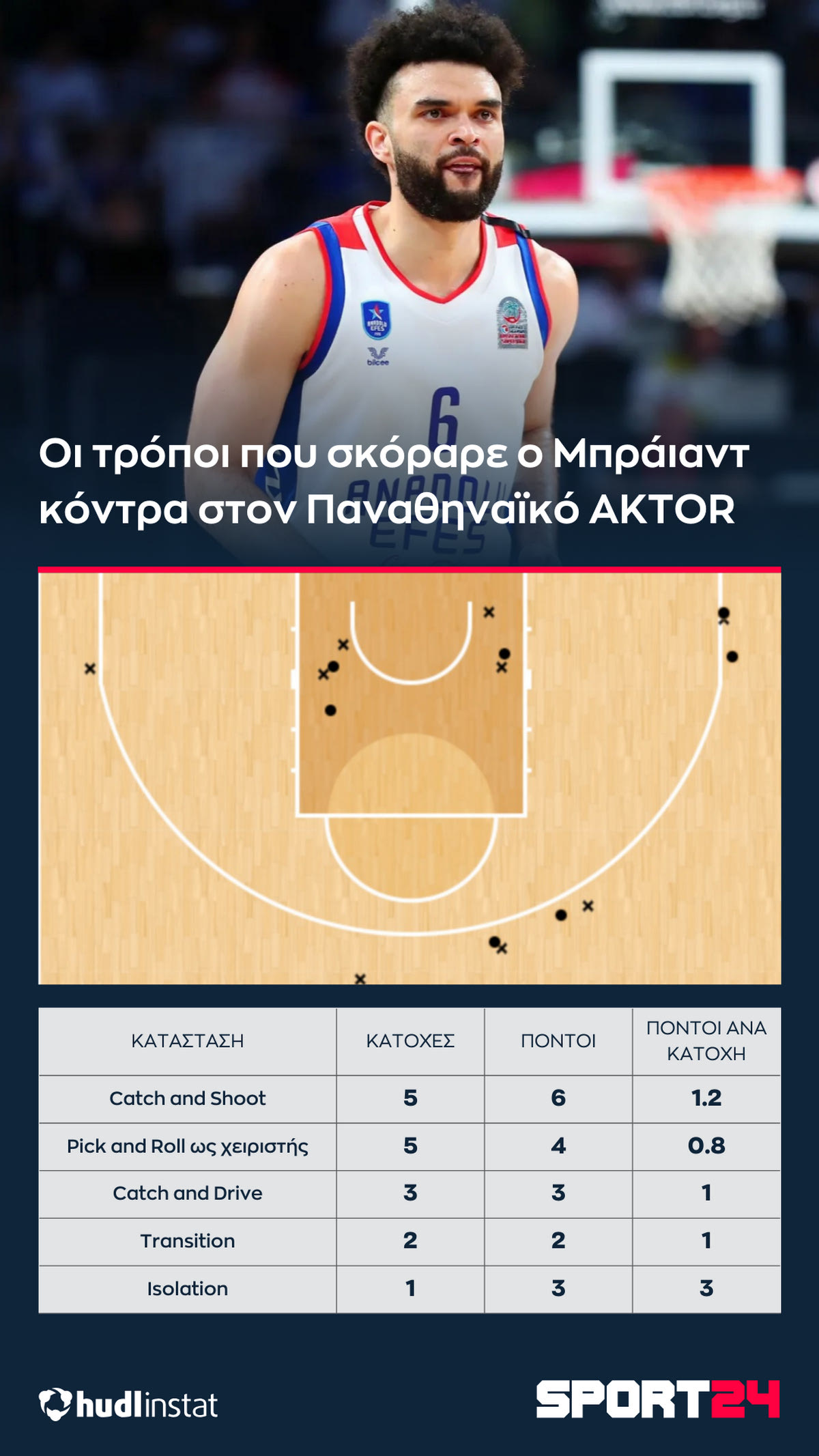 *Με κυκλάκι τα εύστοχα σουτ, με “x” τα άστοχαΟ Μπράιαντ άφησε το παιχνίδι να πάει σε αυτόν. Ήταν πιο μετρημένος, άφησε τον Λάρκιν να δημιουργήσει. Όταν το έκρινε απαραίτητο, όμως, πήρε τα σουτ που έπρεπε και έκανε ζημιά στον Παναθηναϊκό AKTOR. Τα εύσημα βέβαια πρέπει να πάνε και στον Λάρκιν για την χθεσινή νίκη της Εφές.
