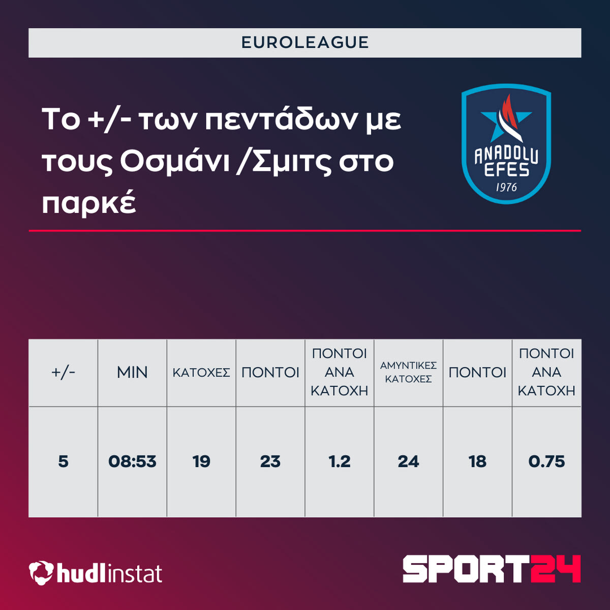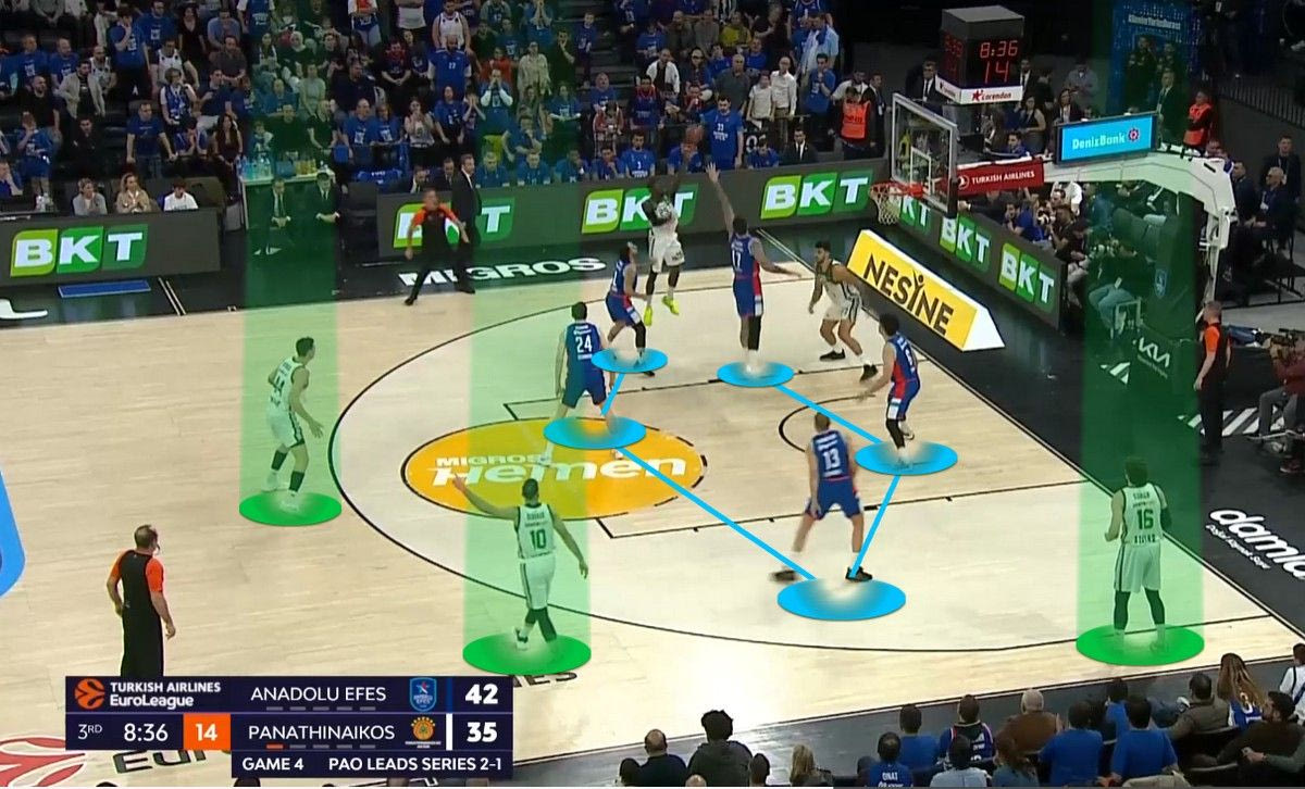 Το σχήμα με τους Σμιτς και Οσμάνι άνοιξε το γήπεδο. Η Εφές έπαιξε το λεγόμενο “5 Out”, όπου υπάρχουν δηλαδή 5 σουτέρ στο παρκέ στο ύψος του τριπόντου, ανοίγοντας την ρακέτα. Στις πρώτες δύο επιθέσεις με τέτοιο σχήμα, η Εφές είδε τους Οσμανί και Σμιτς να ευστοχούν σε τρίποντο. Κάπως, έτσι, ακολούθησε αυτή η φάση: