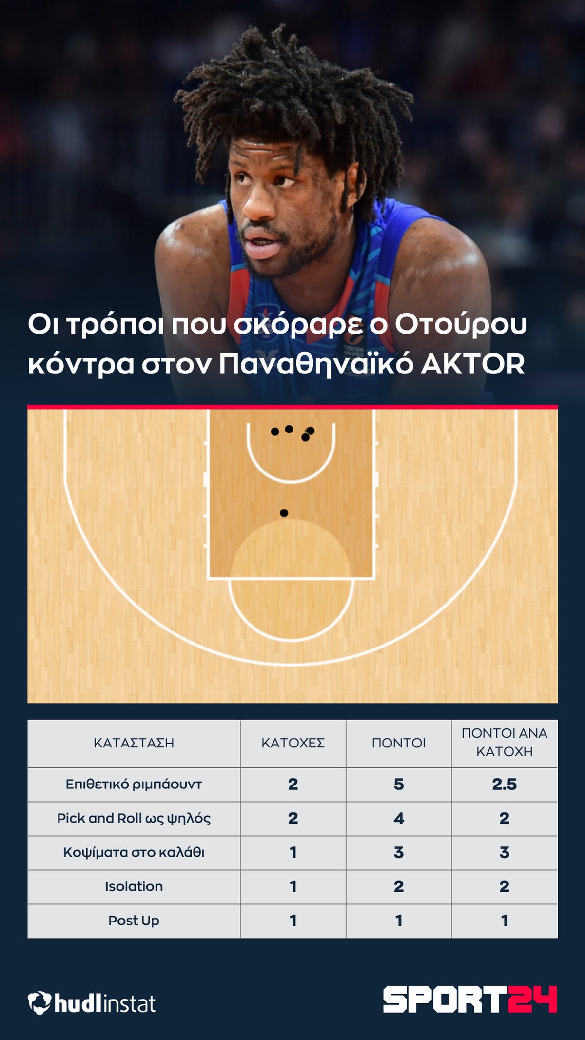 Ο Οτούρου μπορεί να κάνει συγκεκριμένα πράγματα καλά. Είναι ένας αθλητικός, Pick and Roll ψηλός. Εξαρτάται από τους συμπαίκτες του για να σκοράρει, ενώ εναλλακτικά παίρνει πόντους από επιθετικό ριμπάουντ. Κόντρα σε έναν Παναθηναϊκό AKTOR με αργές – και ενίοτε ράθυμες – αντιδράσεις, έδωσε ρεσιτάλ, έχοντας 15 πόντους με 6/6 δίποντα και 4 ριμπάουντ, δύο εκ των οποίων επιθετικά.