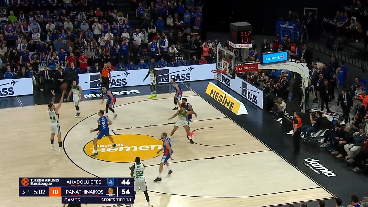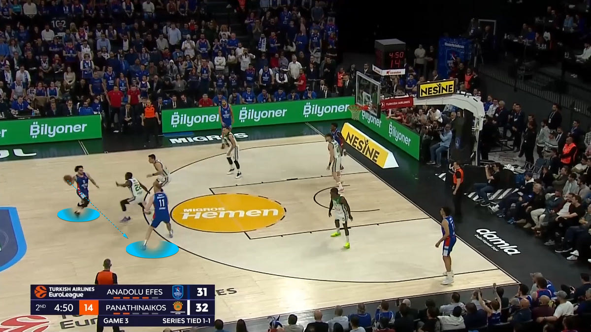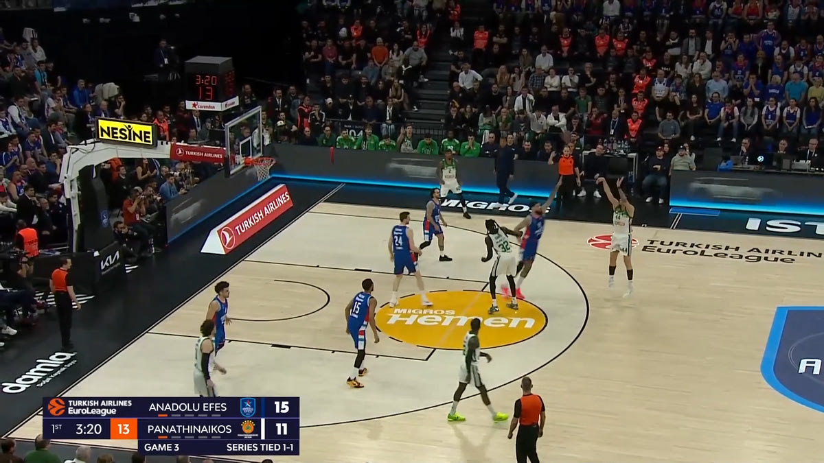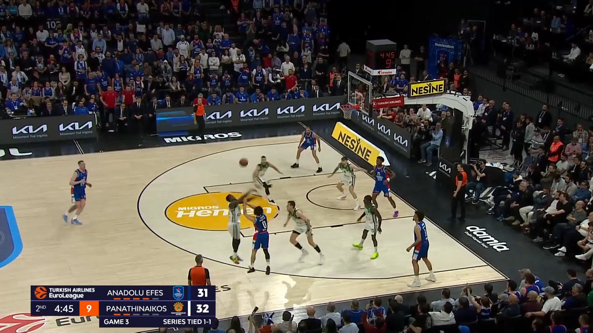 Ο Μήτογλου προλαβαίνει τον Σμιτς, σταματώντας σε πρώτο χρόνο την επίθεση της Εφές. Ο Σμιτς πασάρει άμεσα στον Λάρκιν για να παίξουν νέο Pick and Roll.