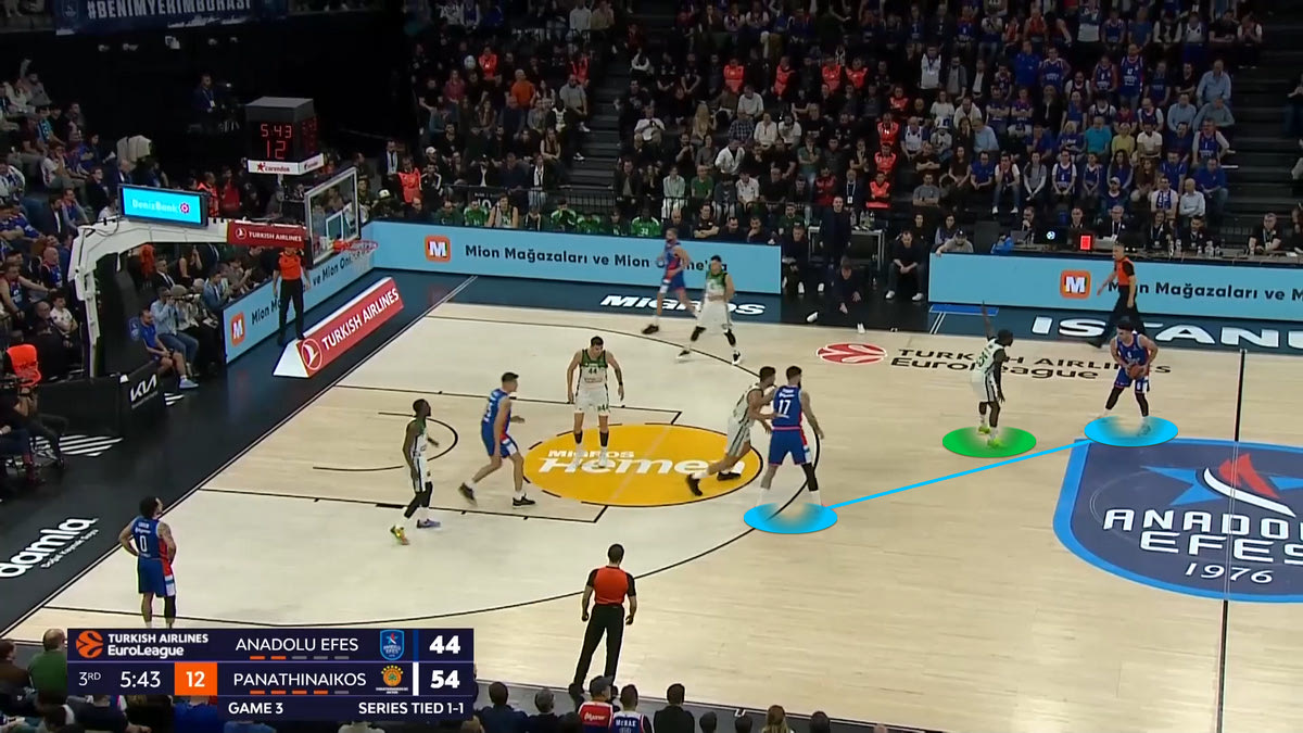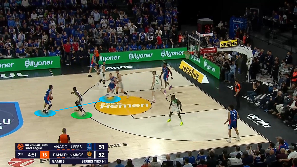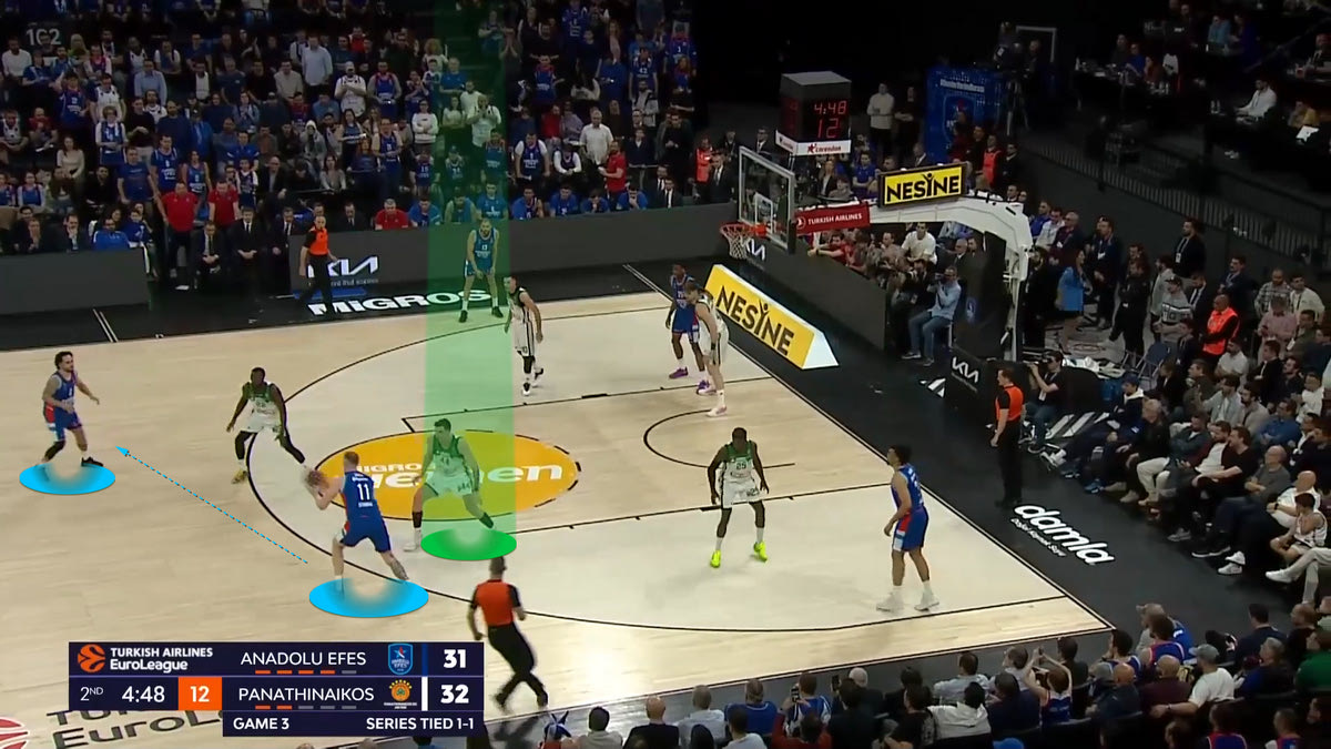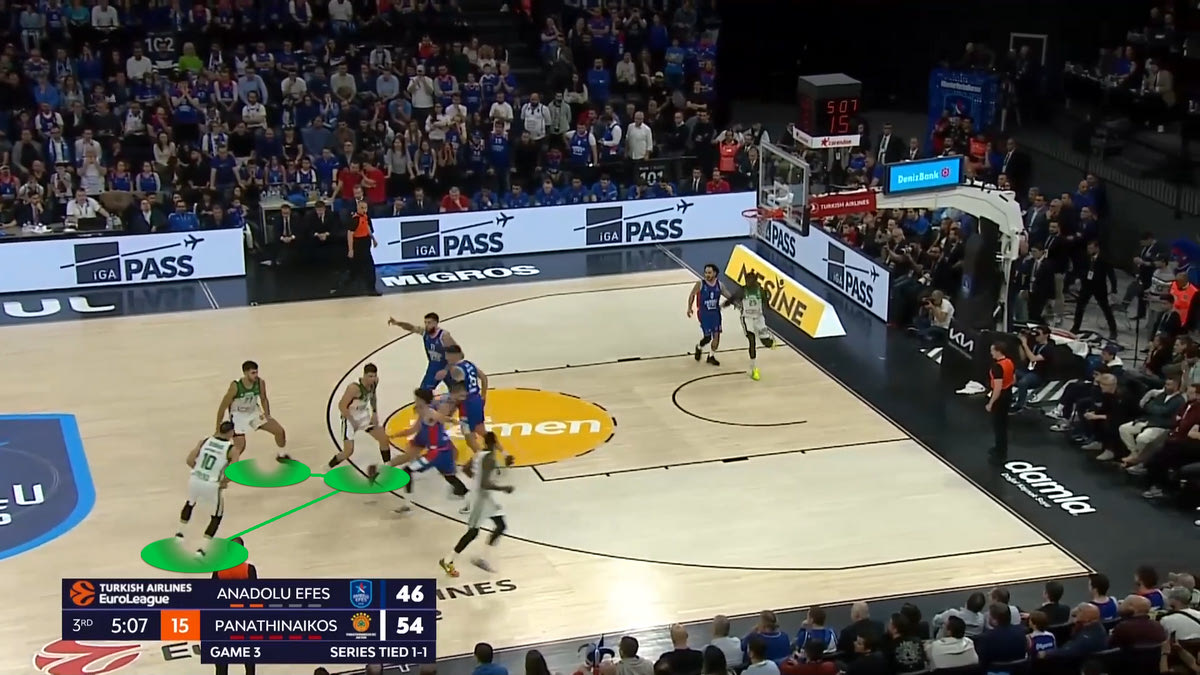 Ο Μήτογλου προλαβαίνει τον Σμιτς, σταματώντας σε πρώτο χρόνο την επίθεση της Εφές. Ο Σμιτς πασάρει άμεσα στον Λάρκιν για να παίξουν νέο Pick and Roll.
