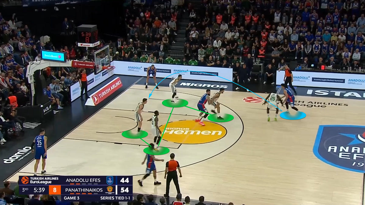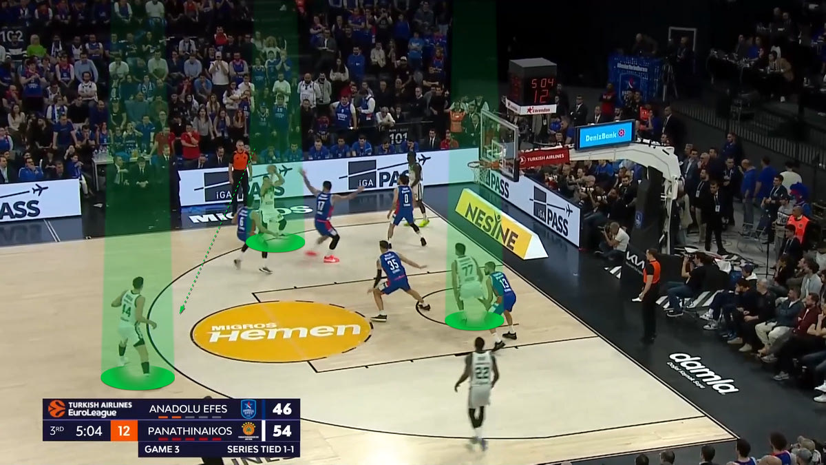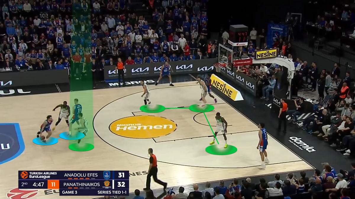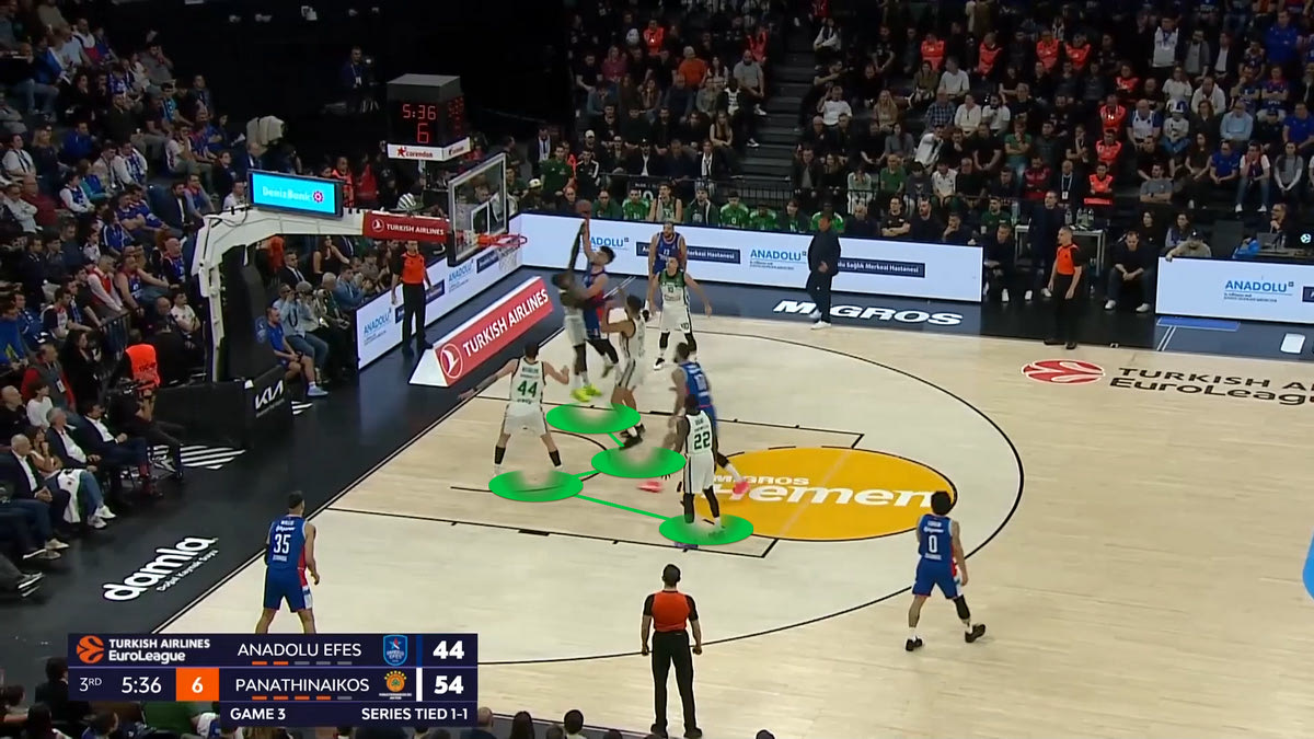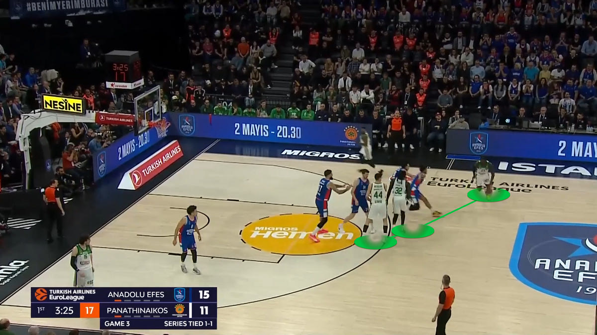 Ο Παναθηναϊκός AKTOR είχε πληγωθεί από το Pick and Roll της Εφές στα δύο πρώτα ματς της σειράς, τόσο από πόντους των γκαρντ των Τούρκων, όσο και από τους ψηλούς της. Στο Game 3 θέλησε να το σταματήσει αυτό με κάθε κόστος. Και τα κατάφερε, αφού – σύμφωνα με το Hudl Instat – κράτησε την Εφές στους μόλις 3 πόντους σε 11 κατοχές όπου το σουτ σε κατάσταση Pick and Roll την προσπάθεια πήρε ο χειριστής της μπάλας, ενώ παράλληλα δέχθηκε μόλις 2 πόντους από ρολάρισμα του αντίπαλου ψηλού.