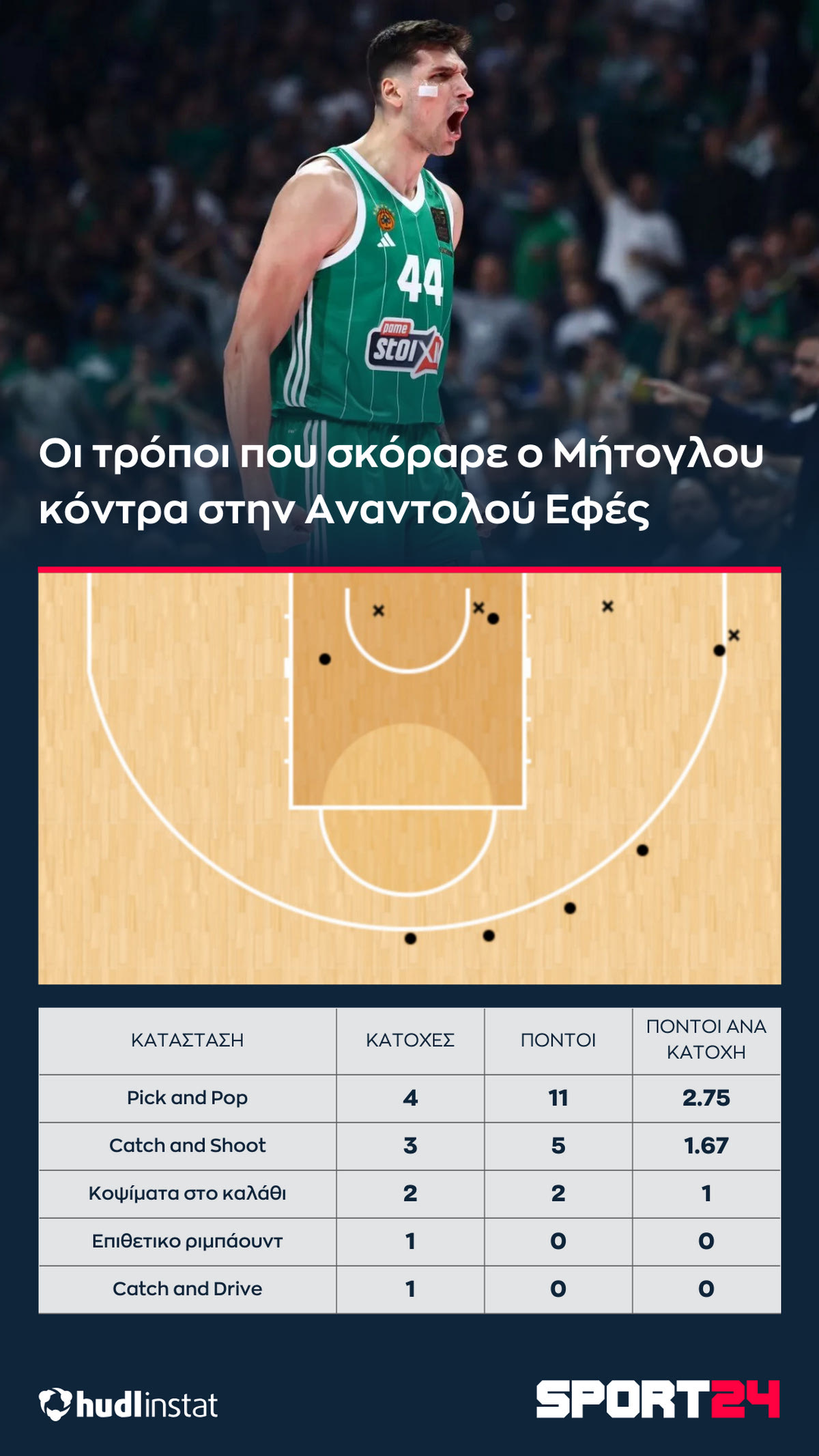 Ο Παναθηναϊκός AKTOR είχε ανάγκη από ένα καλό ματς του Μήτογλου και το πήρε. Για να γίνει αυτό, χρειάστηκε να τον απελευθερώσει με ένα γνωστό play: Το 77 Screen – ή αλλιώς Double Drag Screen – που έστησε. Είναι ένα play στο οποίο ο χειριστής της μπάλας παίρνει δύο σερί σκριν στην κορυφή της ρακέτας, με τους δύο σκρινέρ τότε να παίρνουν αντίθετη πορεία, αφού ο ένας ρολάρει στο καλάθι και ο άλλος κάνει Pop Out στην περιφέρεια. Στο ματς με την Εφές, ο παίκτης που έκανε Pop Out ήταν ο Μήτογλου. Ιδού ένα παράδειγμα: