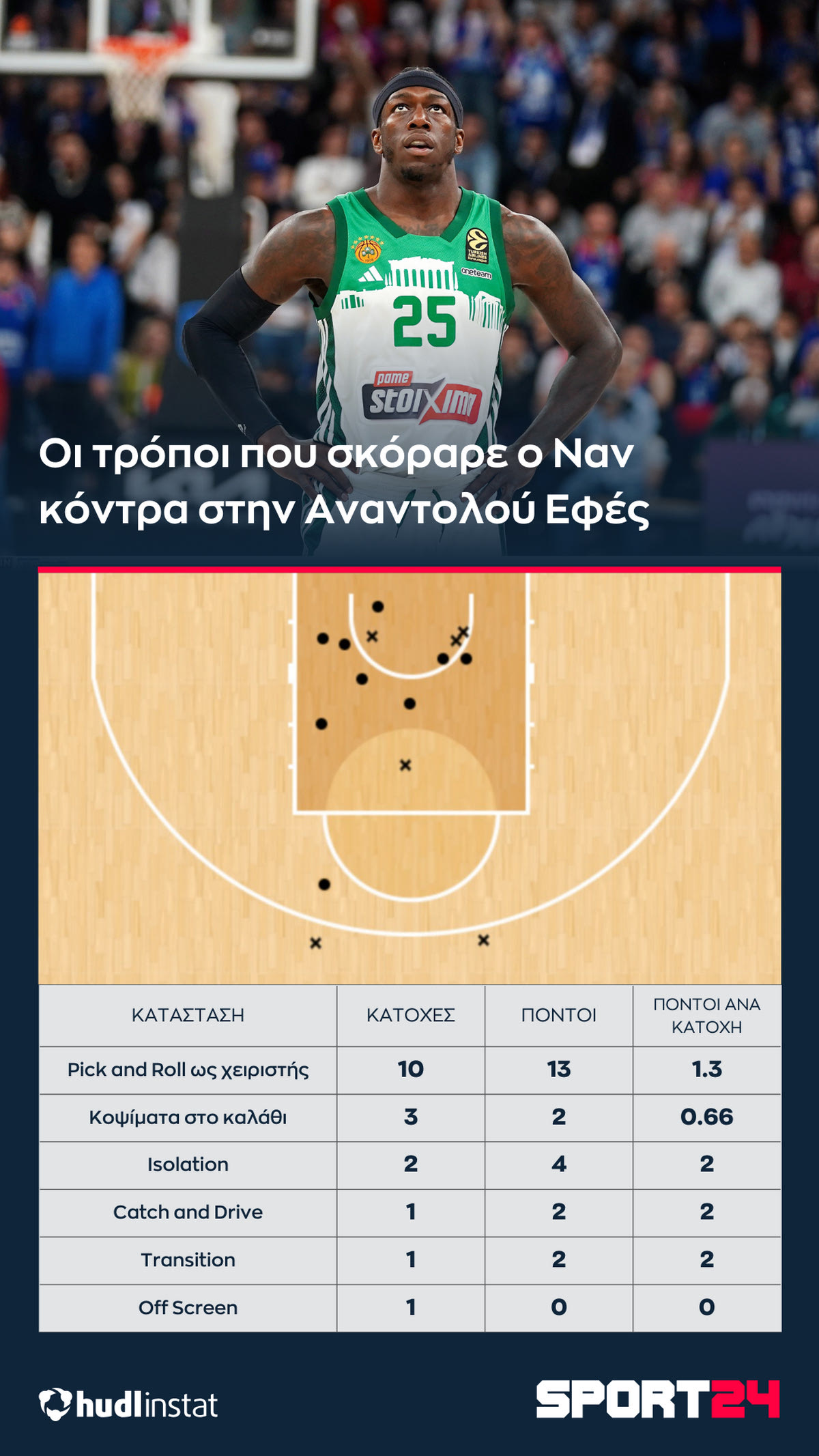 *Με κυκλάκι τα εύστοχα σουτ, με “x” τα άστοχαΟ Ναν έδειξε υπομονή. Πάσαρε όταν έπρεπε και – όταν μύρισε αίμα – εκτέλεσε σε κατάσταση Pick and Roll την Αναντολού Εφές. Πριν γίνει βέβαια αυτό, ήταν ο Ντίνος Μήτογλου (18 πόντοι και 5 ριμπάουντ) που έδωσε το σύνθημα με τα σουτ του στο ξεκίνημα του αγώνα. Παράλληλα – και καθόλου τυχαία – ήταν πάλι ο Μήτογλου που κλείδωσε την νίκη, όταν με το τρίποντό του έκανε το σκορ 74-79 λίγο πριν από το φινάλε.