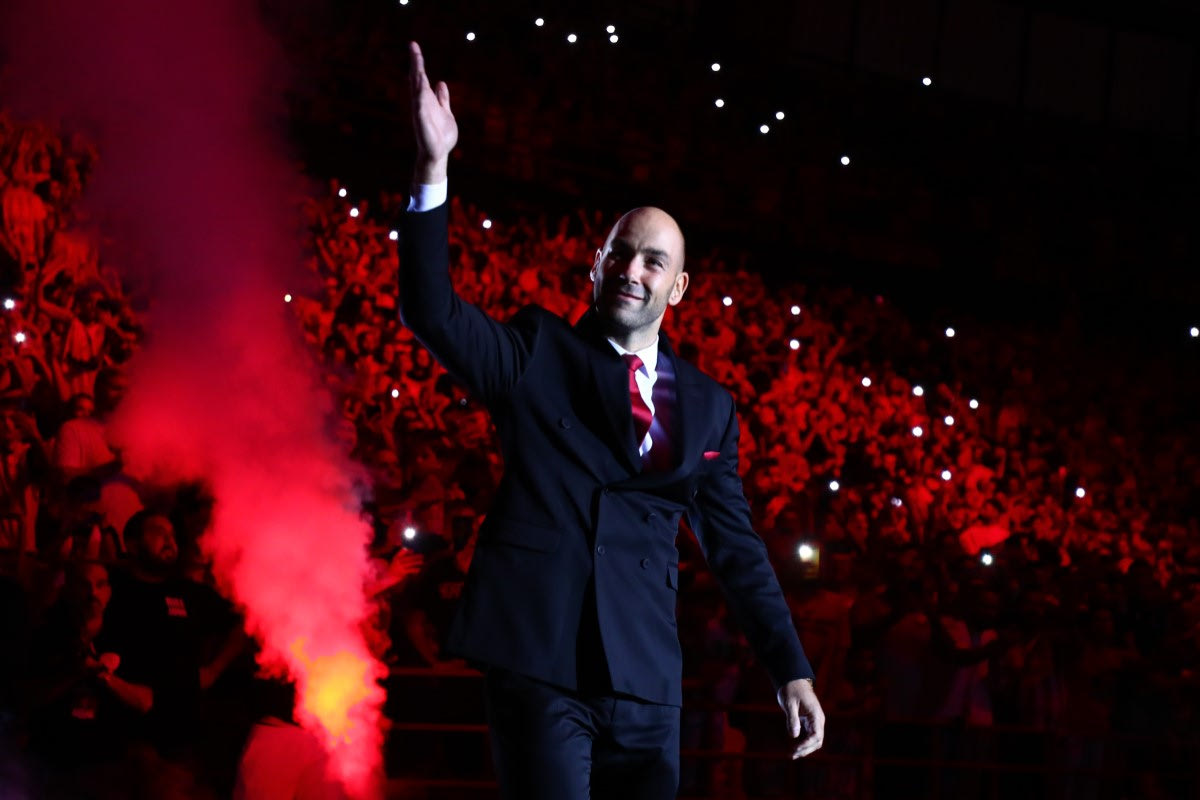 Ανατριχίλα στο Στάδιο Ειρήνης και Φιλίας με τον Βασίλη Σπανούλη να κάνει την είσοδό του στο παρκέ και να αποθεώνεται από τους χιλιάδες κόσμου που βρέθηκαν στο γήπεδο.