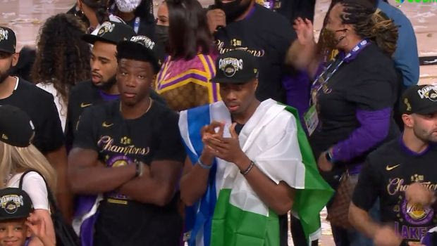 Με τους Λέικερς να ετοιμάζονται να παραλάβουν το τρόπαιο, o Κώστας Αντετοκούνμπο εμφανίστηκε στην τελετή έχοντας την ελληνική σημαία στον δεξιό του ώμο και την σημαία της Νιγηρίας στον αριστερό του ώμο.