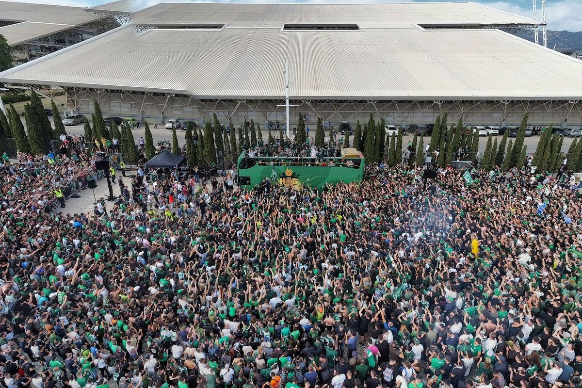 Οι παίκτες και το επιτελείο των πρασίνων μπήκαν στο ανοικτό πούλμαν της ομάδας και έκαναν τη διαδρομή για το ΟΑΚΑ, συνοδευόμενοι από τον κόσμο.