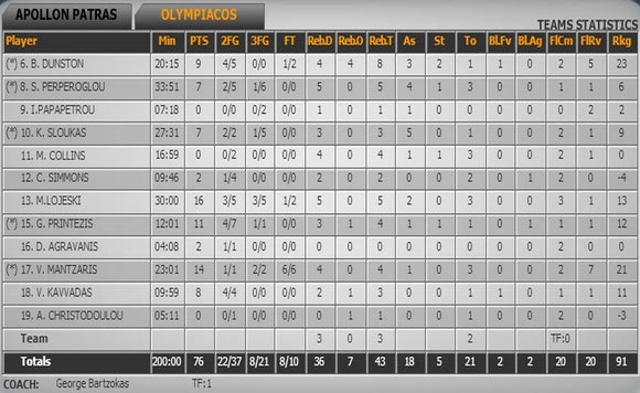 Ολυμπιακός(Μπαρτζώκας): Ντάνστον 9, Περπέρογλου 7 (1), Παπαπέτρου, Σλούκας 7 (1), Κόλινς, Σίμονς 2, Λοτζέσκι 16 (3), Πρίντεζης 11 (1), Αγραβάνης 2, Μάντζαρης 14 (2), Καββαδάς 8, Χριστοδούλου