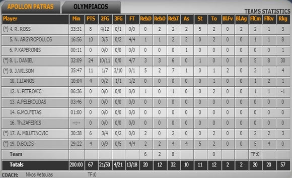Απόλλωνας(Βετούλας): Ρος 8, Αργυρόπουλος 10, Καπερώνης, Ντάνιελ 24, Γουίλσον 11 (3), Λιανός 4 (1), Πέτροβιτς, Πελεκούδας, Μολφέτας, Μιλουτίνοβιτς 6. Μπολντς 4.