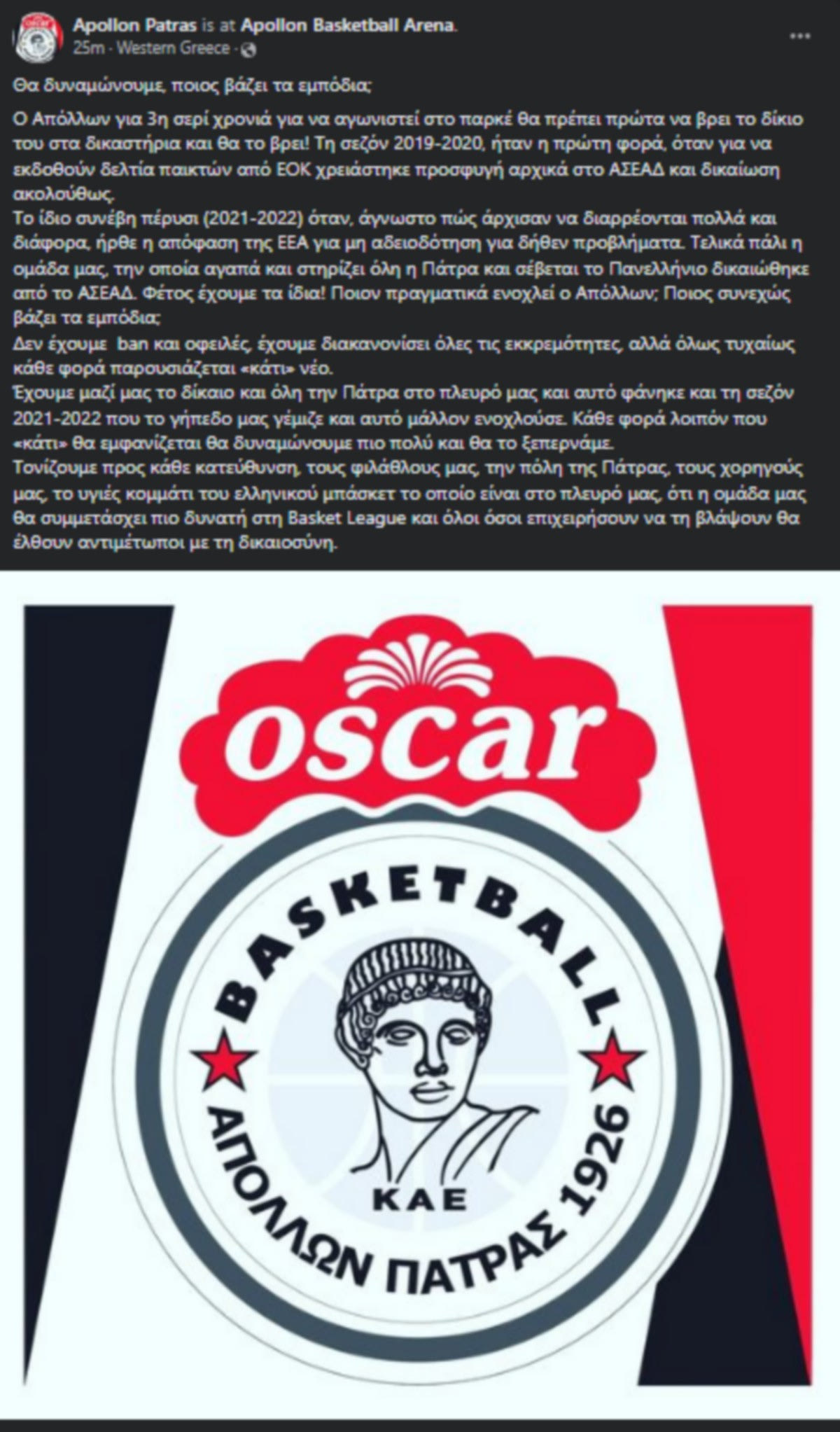 Απόλλωνας Πάτρας: “Για να αγωνιστεί η ομάδα στο παρκέ θα πρέπει να βρει το δίκιο της στα δικαστήρια και θα το βρει”