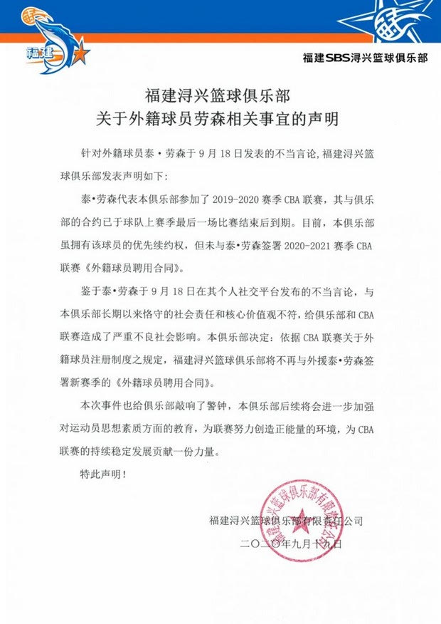 Το ΝΒΑ του έκλεισε την πόρτα, τώρα και η CBA τον στέλνει σπίτι του. Ο Τάι Λόσον εκδιώχθηκε από τους Φουτζιάν Στάρτζεονς εξαιτίας της ανάρμοστης συμπεριφοράς του στα social media.